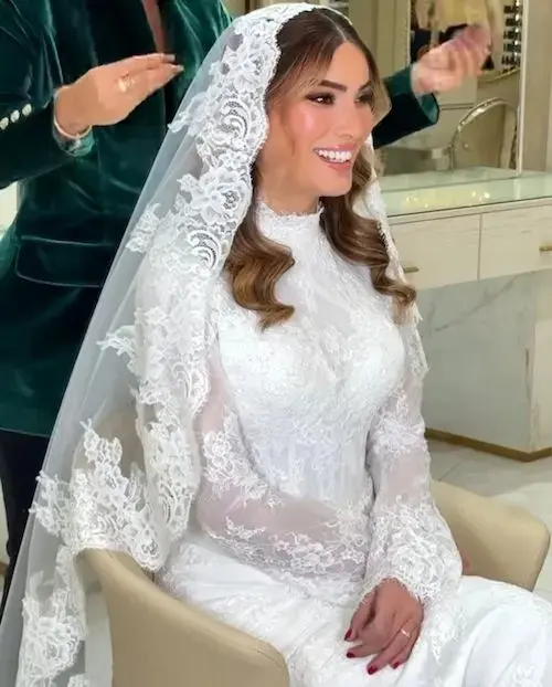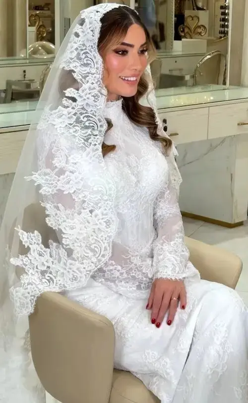 در تصاویر و ویدئوهای منتشرشده، متین ستوده لباس عروسی خاص و پرجزئیاتی به تن دارد؛ پیراهنی از گیپور که از سر تا پا پوشیده شده و ظاهری ظریف و کلاسیک ایجاد میکند. تور بلند و دنبالهدار او با حاشیههای طرحدار، این استایل را بسیار زیباتر کرده است. بسیاری از مخاطبان معتقدند که این لباس رسمی، از لباس عروس اصلی او شیکتر و جذابتر است. موهای باز و موجدار او، همراه با آرایشی شیک و حرفهای، ظاهر او را برای عکاسی رسمی کامل کرده و تصویری هماهنگ و چشمنواز ارائه میدهد. این حضور جدید نشان میدهد که ستوده هنوز یکی از چهرههای محبوب و مورد توجه در رویدادهای مرتبط با مد و زیبایی است.