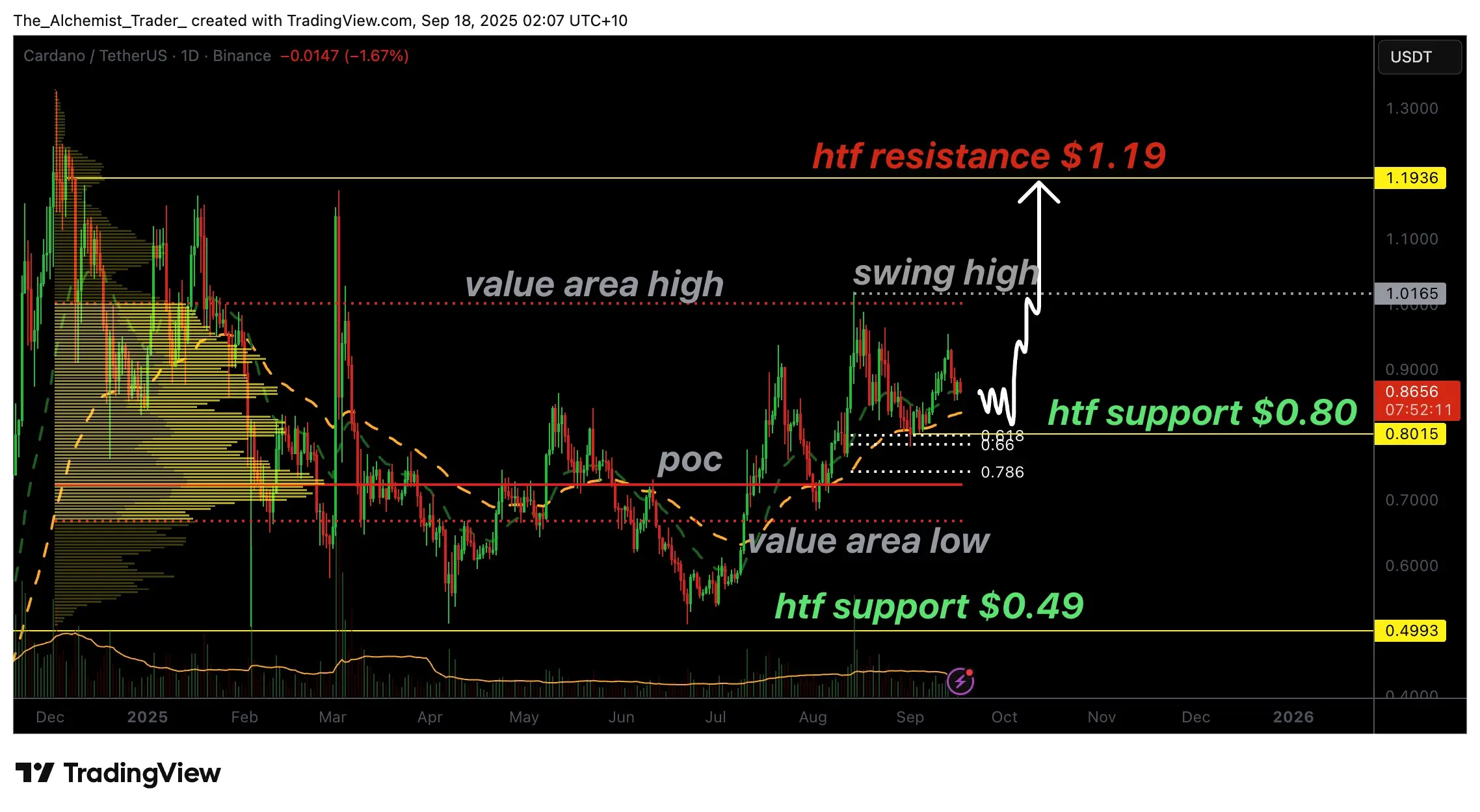 در تحلیلهای فنی اخیر، کاردانو نشان از مقاومت و پایداری قابل توجهی دارد. این رمزارز پس از کاهشهای اخیر، از ناحیه ۰.۸۰ دلار به شدت برگشت و در حال حاضر در مسیر تثبیت و ادامه روند صعودی قرار دارد. این سطح در نزدیکی ۰.۶۱۸ فیبوناچی ریتریسمنت و همراستا با میانگین متحرک اصلی قرار گرفته است، که این همپوشانی، آن را به یک پایه تکنیکال قدرتمند تبدیل کرده است. اگرچه قیمت هنوز نتوانسته است ناحیه ارزشگذاری بالای بازار را پس بگیرد، اما ساختار نموداری همچنان نشان میدهد که بازار به سمت سمتهای مثبت حرکت میکند، به شرط حفظ سطح حمایتی ۰.۸۰ دلار.