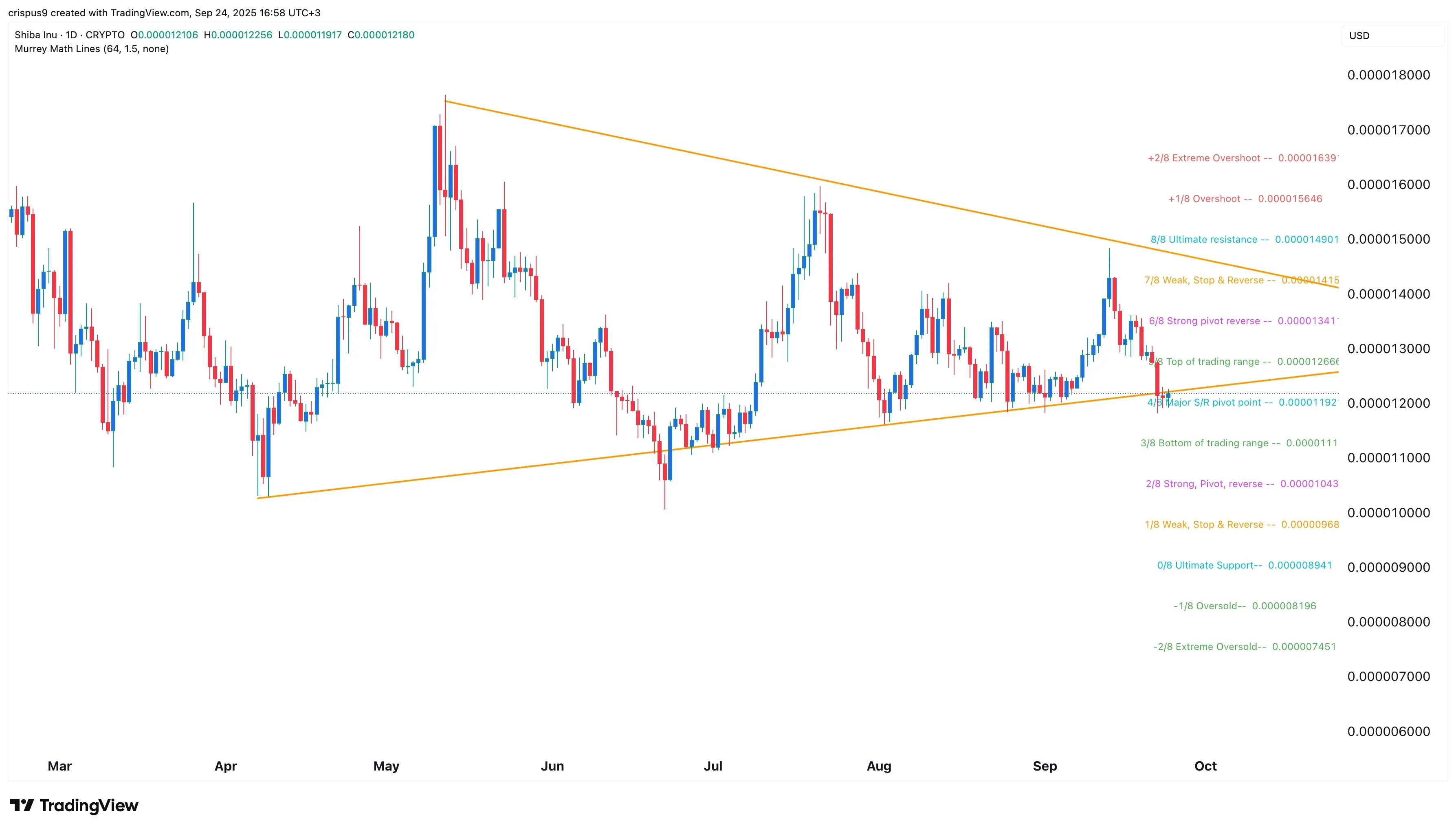 تحلیل فنی نشان میدهد که قیمت شیبا اینو (Shiba Inu) ممکن است به زودی بهبود یابد، چرا که این ارز دیجیتال به سطح حمایت حیاتی رسیده است. این سطح در بخش پایینی الگوی مثلث متقارن قرار دارد که خطوط آن در حال نزدیک شدن به نقطه تقاطع هستند، و احتمالاً نشانهای از پایان روند اصلاحی است.