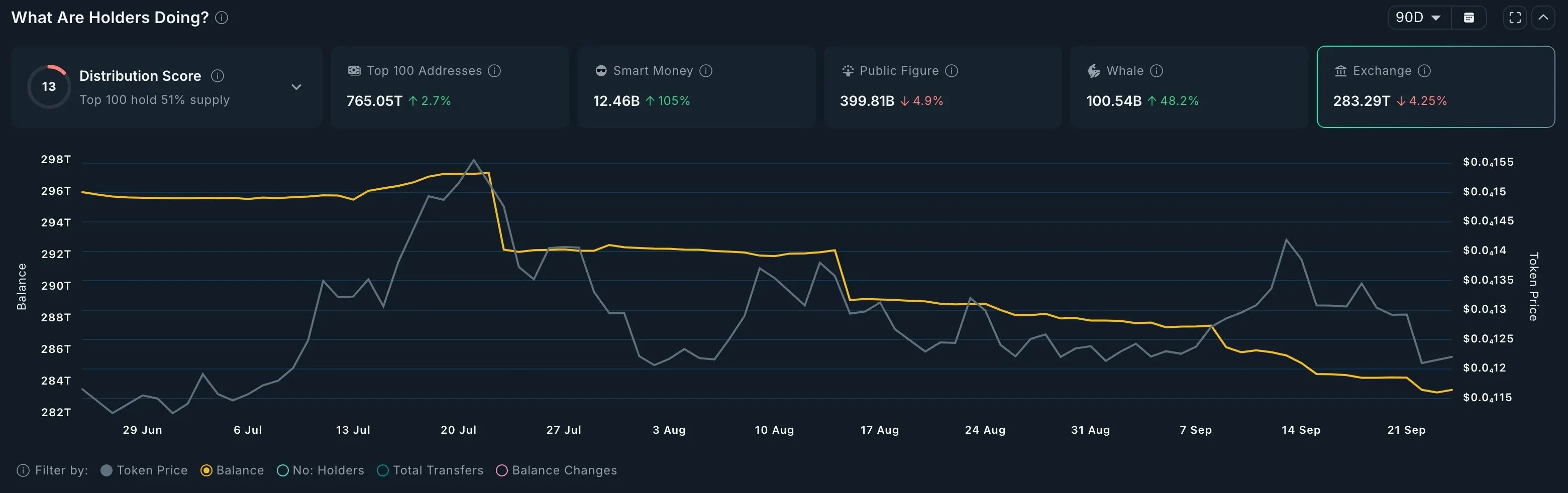 در کنار این موارد، کاهش موجودی SHIB در صرافیها نیز تاییدی بر تمایل بازار به نگهداری بلندمدت است؛ در حال حاضر، حدود ۲۸۳ تریلیون توکن در کیف پولهای صرافیها قرار دارد که نسبت به سه ماه گذشته، کاهش قابل توجهی از ۲۹۷ تریلیون دارد.