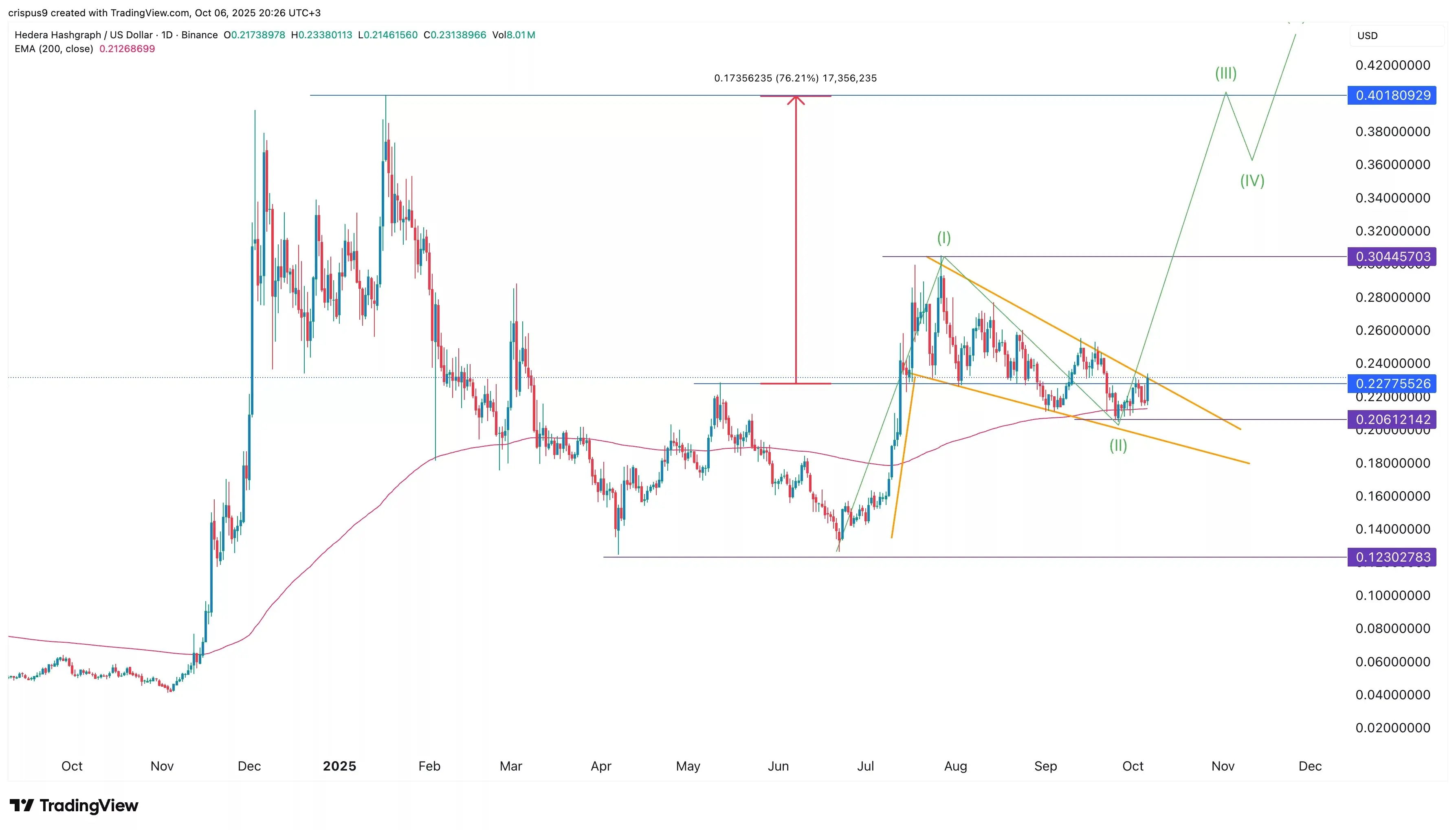 سپس، HBAR یک الگوی وِیج یا همان wedge نزولی را تشکیل داده است؛ این الگو از دو خط روند همگرا و نزولی تشکیل شده و بخشی از الگوی پرچم صعودی بزرگتری است. این الگو همچنین در مرحله دوم موج impulso در نظریه امواج الیوت قرار دارد، که پس از آن موج سوم قرار میگیرد؛ موجی که معمولاً بلندترین و پرپتانسیلترین موج در روند صعودی است.