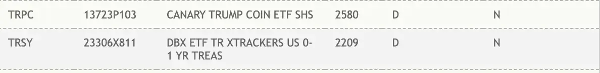 شرکت کاناری کپیتال در اواخر ماه اوت، درخواست ثبتنام در فرم S-1 برای راهاندازی ETF اسپات مبتنی بر رمزارز، با تمرکز بر توکن میم ترامپ (TRUMP) که بر اساس اعلام رسمی، نماد رسمی توکن میم ترامپ است، ارائه کرد. هدف این اقدام جذب سرمایهگذاریهای نهادی است تا از طریق این صندوق، سرمایهگذاران بتوانند در معرض رمزارزهای با محوریت سیاسی قرار گیرند، رمزارزی که از سوی خانواده ترامپ و خود دونالد ترامپ، رئیسجمهور سابق آمریکا، مورد تأیید قرار گرفته است.