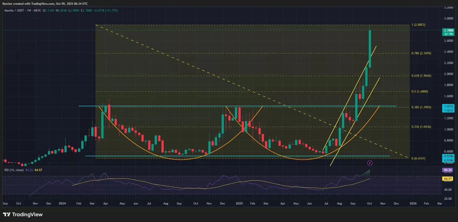 در نمودار، توکن مَنتِل (Mantle) از کانال موازی صعودی نیز خارج شده است، کانالی که با پایینترین و بالاترین سطحهای افزایشی در حال حرکت است و نشاندهنده روند غالب صعودی است.