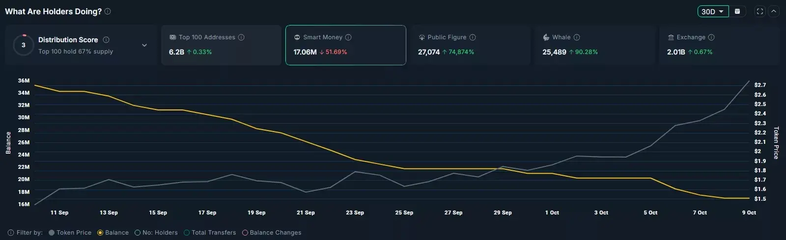 در حالی که روند قیمتی متل هنوز نشانهای از کاهش ندارد، برخی دادههای زنجیرهای هشدارهایی را درباره وضعیت بازار به همراه دارند. بر اساس تحلیل نانسان (Nansen)، کیفپولهای متعلق به سرمایهگذاران هوشمند یا کسانی که با نقدینگی عمیق و حضور زودهنگام در بازار فعالیت میکنند، در حال کاهش تدریجی داراییهای خود هستند. این کیفپولها در مدت زمان کوتاهی، تعداد توکنهای نگهداریشان از ۳۵.۳۱ میلیون در ۱۰ سپتامبر به تنها ۱۷.۰۶ میلیون در ۹ اکتبر کاهش یافته است، که ممکن است نشاندهنده سودگیری و جابجایی به سمت رمزارزهای رقیب باشد.