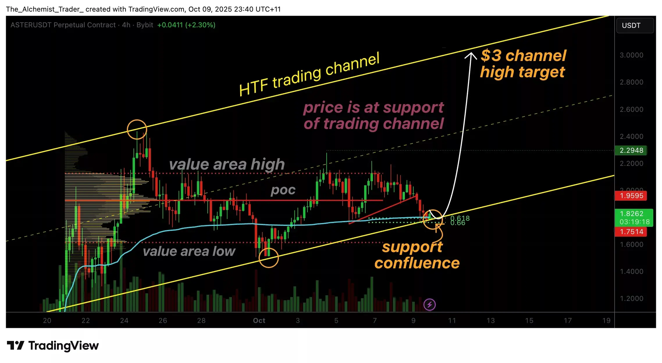 در تحلیل اخیر، کاهش قیمت آستر در محدوده ۱.۷۰ دلار، این سطح را به منطقه حمایتی کلیدی تبدیل کرده است؛ منطقهای که در گذشته نقطه آغاز روندهای صعودی بزرگ بوده است. این دارایی در قالب یک کانال صعودی در تایمفریمهای بالاتر در حال نوسان است، جایی که هر اصلاح قیمتی معمولاً با تشکیل قله پایینتر (higher low) همراه بوده و پس از آن روند صعودی ادامه یافته است.
