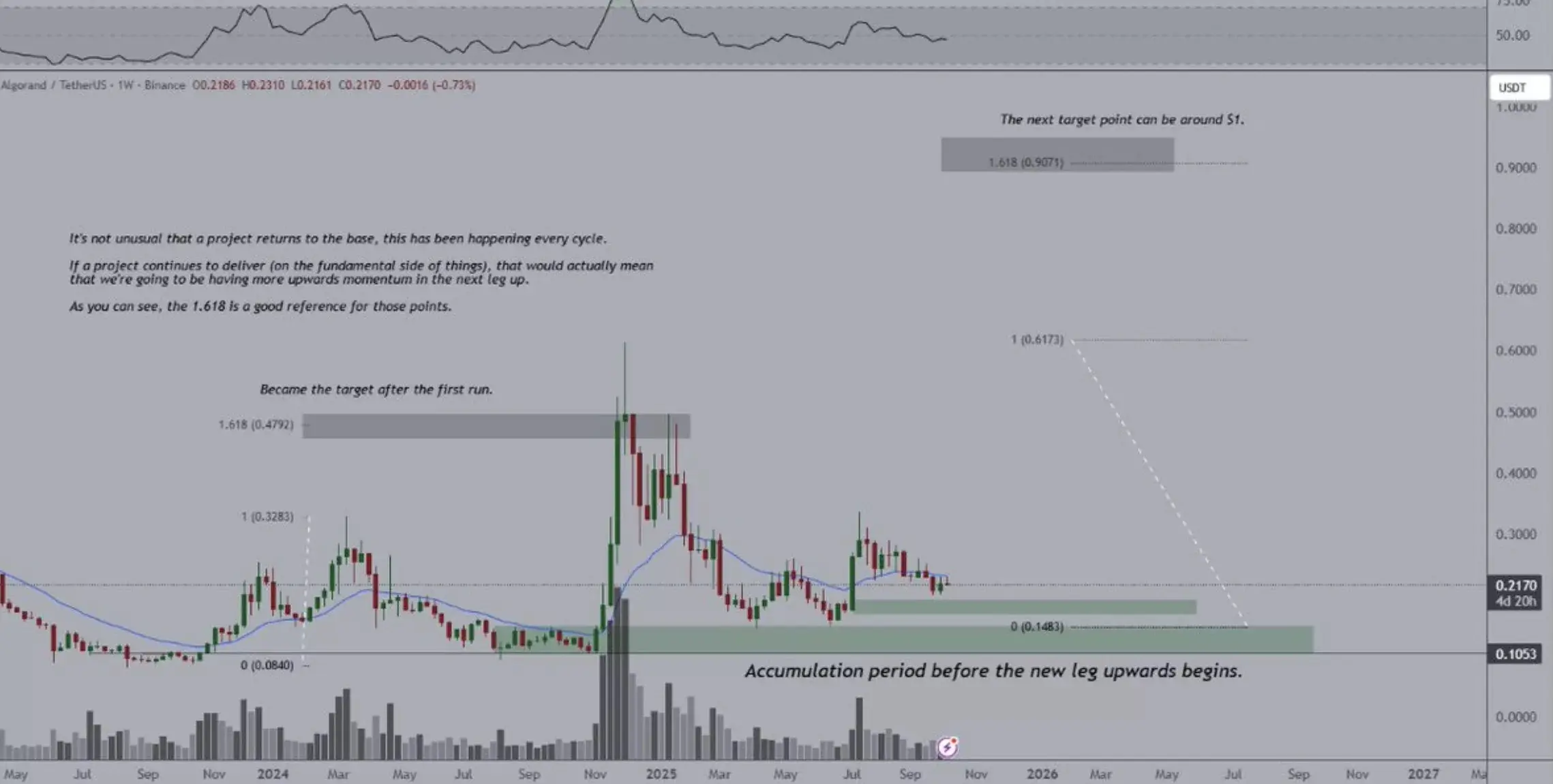 ون د پاپ معتقد است که عبور قیمت از میانگین متحرک ۲۰ هفتهای میتواند نشانگر شروع یک روند معکوس گستردهتر برای ALGO باشد و احتمالاً منجر به یک روند صعودی تا سطح دلار ۱ شود. این هدف قیمتی همراستا با سطح فیبوناچی ۱.618 در حدود ۰.۹۰ تا ۱ دلار قرار دارد.