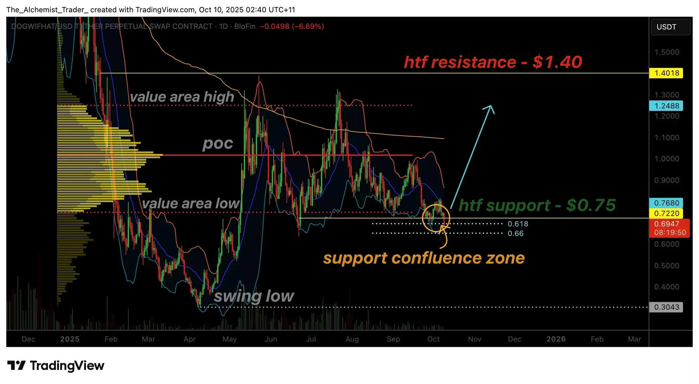 تحلیل قیمت دوجوایفهات (Dogwifhat) نشان میدهد که سطح حمایتی ۰.۷۵ دلار نقش کلیدی در تعیین مسیر حرکت این رمزارز ایفا میکند. قیمت در چندین نوبت این ناحیه را آزمایش کرده و به آن احترام گذاشته است، که نشانگر احتمال شروع فاز تجمع قوی است. همچنین، این سطح با منطقه طلایی فیبوناچی ۰.۶۱۸ همراستا است، امری که اعتبار آن را تقویت میکند. در تاریخ بازار، اصلاحات در این سطح معمولاً قبل از ادامه روند صعودی رخ میدهند، به شرط آنکه حجم معاملات پایدار باشد و فشار فروش کاهش یابد.