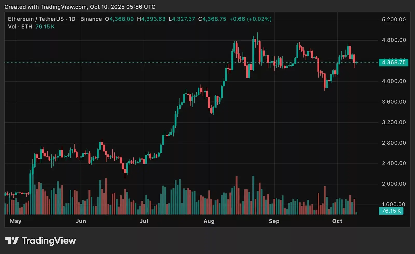 در زمان نگارش این گزارش، اتریوم (Ethereum) در حدود ۴۳۶۸ دلار معامله میشود که نسبت به روز گذشته حدود ۲ درصد کاهش یافته است، بر اساس دادههای سایت crypto.news. در اوایل هفته جاری، این رمزارز در نزدیکی ۴۶۴۵ دلار به بالاترین سطح محلی خود رسید، اما پس از آن، مجدداً کاهش یافت و حمایت مهم ۴۲۵۳ دلار را آزمایش کرد. این نوسان نشاندهنده اصلاح قابل توجه پس از روند صعودی اخیر است، چرا که ETH از اوج روزانه خود عقبنشینی کرده و در نزدیکی سطحهای حمایتی کلیدی تثبیت شده است.