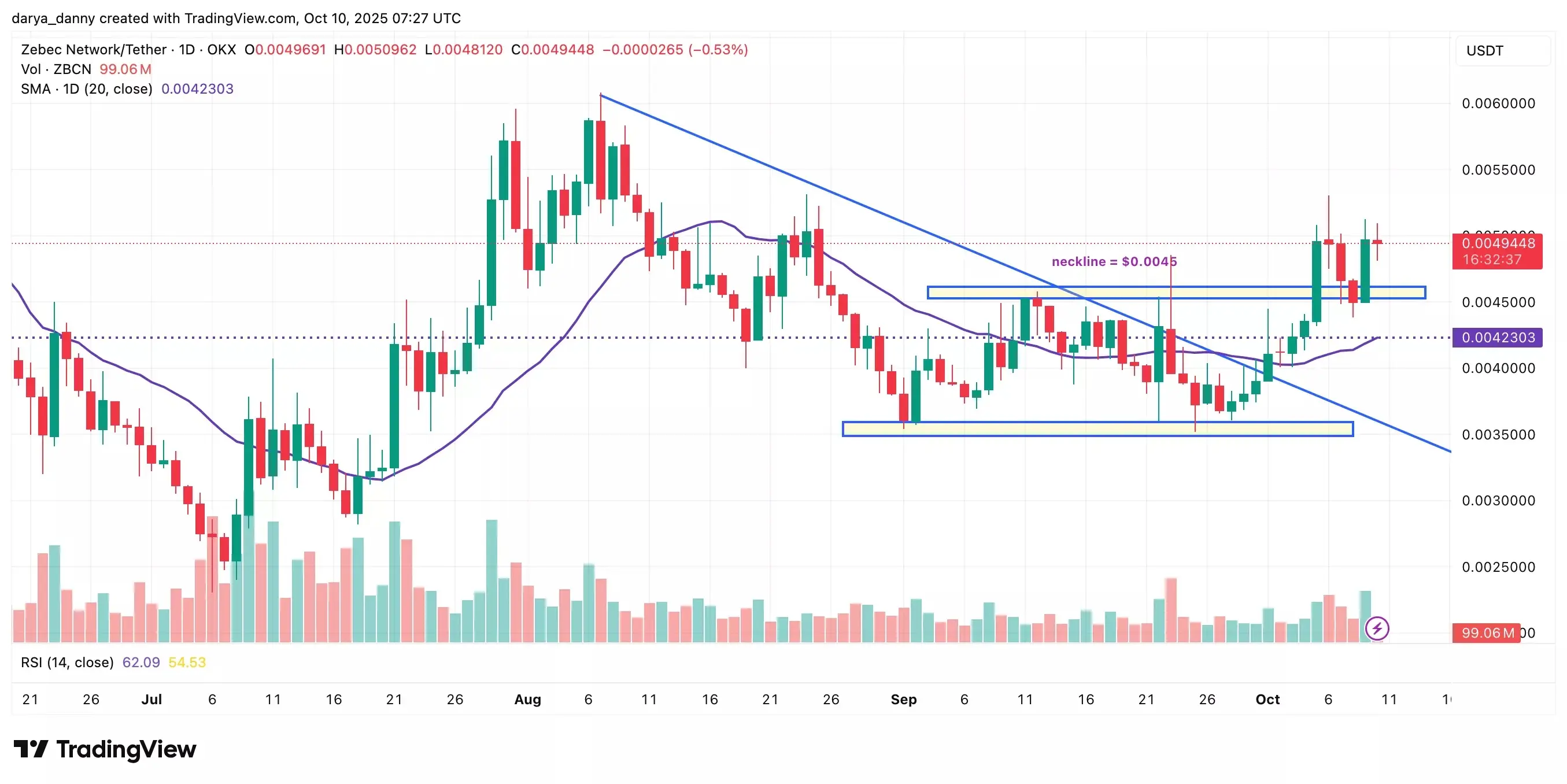 قیمت زبک نتورک (Zebec Network) در حال حاضر در مسیر یک برعکسسازی کامل قرار دارد و هدف آن رسیدن به سطح ۰.۰۰۶۴ دلار است. این روند صعودی ممکن است با توجه به اعلام لیست شدن این رمزارز در پلتفرم کِرَکن (Kraken) تقویت شود، که میتواند فشار خرید را افزایش دهد و روند صعودی را تشدید کند.