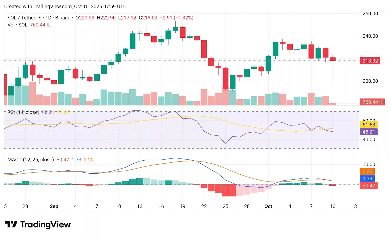 در زمان نگارش این گزارش، قیمت سولانا ۲۱۸.۰۲ دلار است که نسبت به روز گذشته کاهش ۳.۸ درصدی را نشان میدهد. شاخص RSI نیز در سطح ۵۱.۶۶ قرار دارد، که نشاندهنده وضعیت خنثی بازار است. این سطح از نوسان و پایداری، نشان میدهد که بازار هنوز در مرحله تعادل نسبی قرار دارد و روند مشخصی برای صعود یا اصلاح در آینده نزدیک دیده نمیشود.