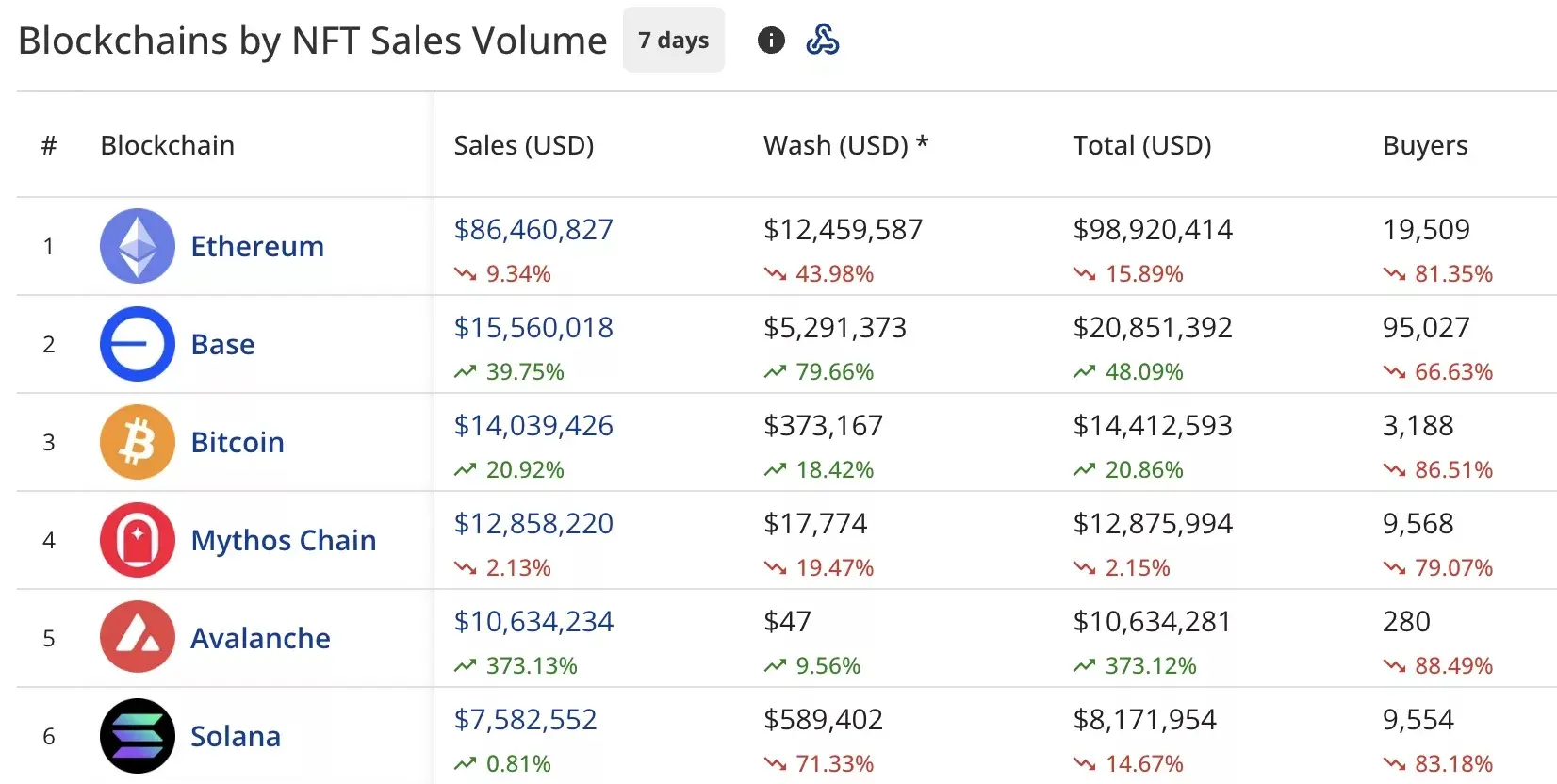 در جایگاه دوم، بلاکچین بیس (Base) قرار گرفت و با ثبت حجم ۱۵.۵۶ میلیون دلار، رشد قابل توجه ۳۹.۷۵ درصدی نسبت به هفته قبل که ۱۰.۹۲ میلیون دلار بود، نشان داد. حجم wash trading در این شبکه نیز به ۵.۲۹ میلیون دلار رسید و تعداد خریداران با کاهش ۶۶.۶۳ درصدی، به ۹۵ هزار و ۲۷ نفر رسید.
