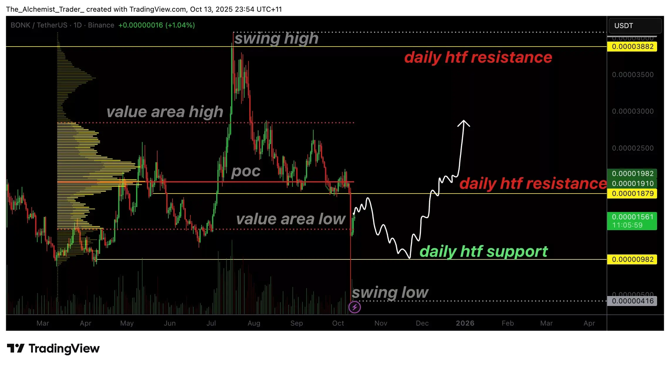 ساختار کلی بازار برای توکن بونک (Bonk) همچنان مثبت و در عین حال شکننده است. پس از شکست قبلی، حرکت صعودی این دارایی در نزدیکی نقطه کنترل روزانه (POC) که بالاترین حجم معاملات را دارد، دچار توقف شده است. عبور قاطع از این سطح، به همراه افزایش حجم، میتواند نشانهای از بازگشت قدرت خریداران باشد و مسیر را برای رسیدن به اوجهای بعدی در ناحیه ارزشگذاری بعدی هموار کند.