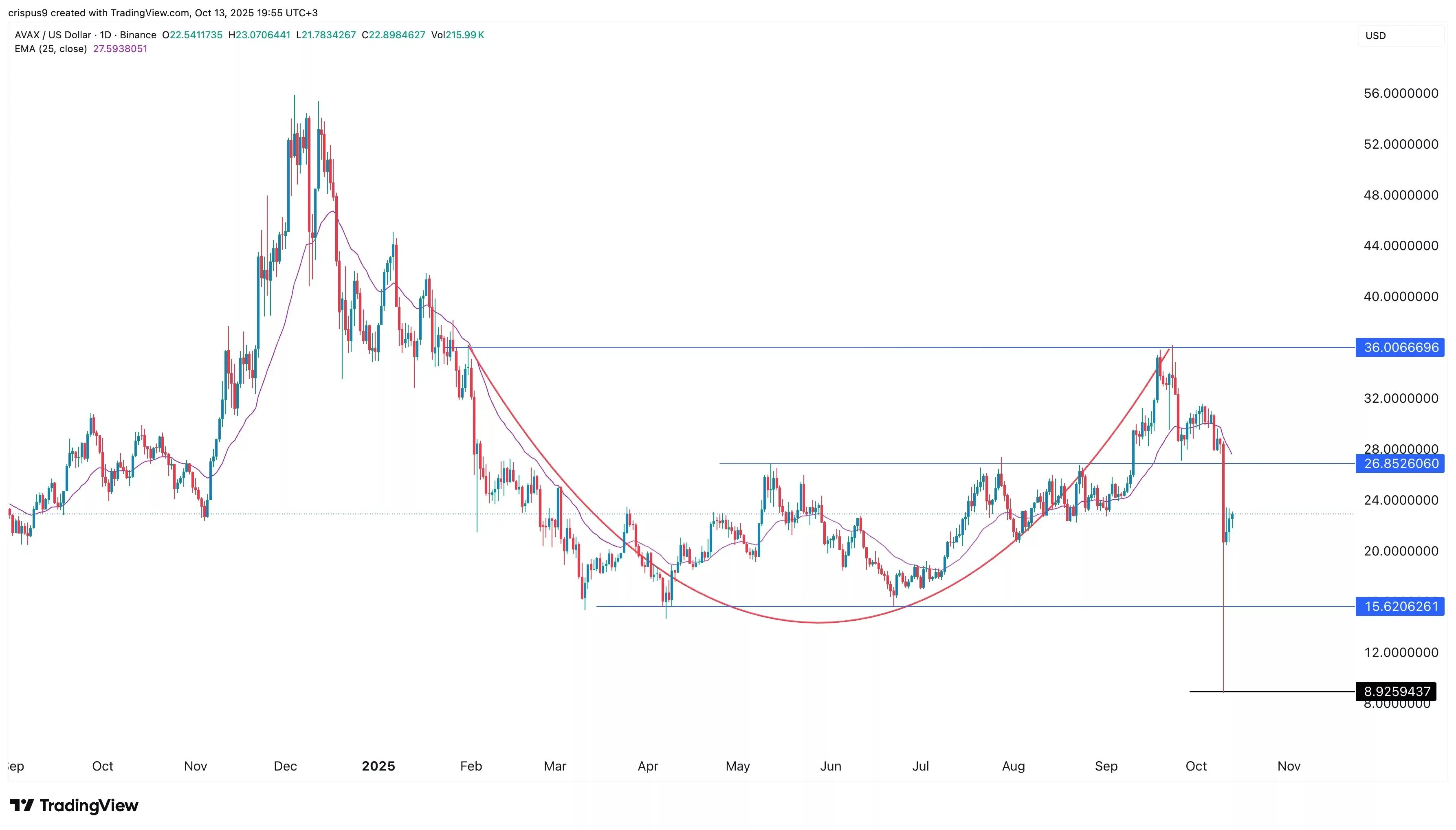 بر اساس تحلیل نمودار تایم فریم روزانه، رمزارز آواکس (AVAX) پس از کاهش به قیمت حدود ۸.۹۲۶ دلار، مجدداً به سمت بالا بازگشت و در حال حاضر در نزدیکی ۲۲.۷۶ دلار قرار دارد. در این روند، شکلگیری یک شمع هامر با بدنه کوچک و سایه بلند پایین نشاندهنده احتمال ادامه روند صعودی پس از کاهشهای قبلی است.