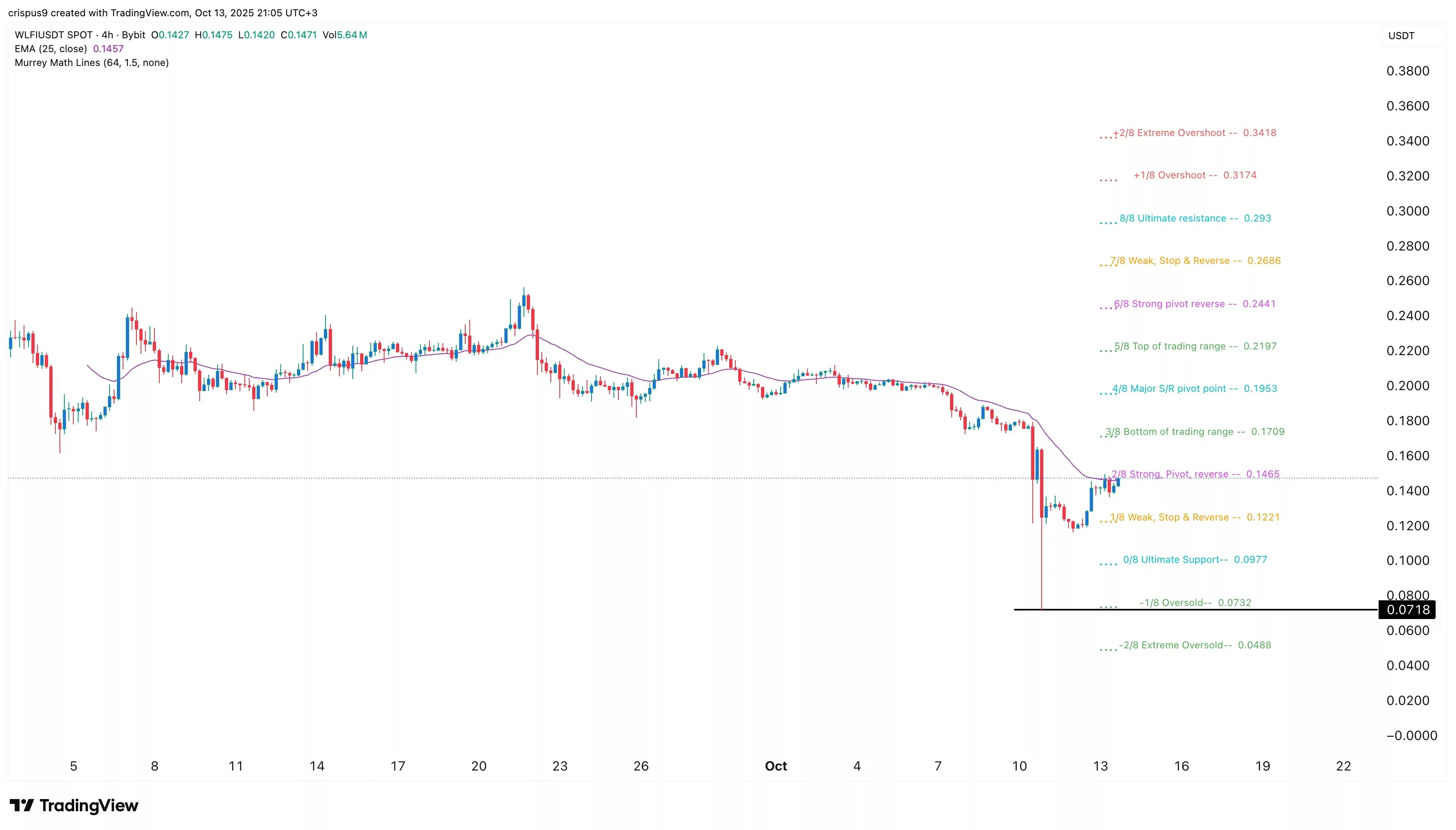 همچنین، WLFI شکلگیری الگوی پرچم صعودی کوچک را نشان میدهد که معمولاً پس از آن شاهد شکست صعودی و ادامه روند افزایشی است. این رمزارز در نزدیکی نقطه عطف مهم در خطوط Murrey Math Lines قرار دارد که به عنوان یک نقطه معکوس قوی شناخته میشود.