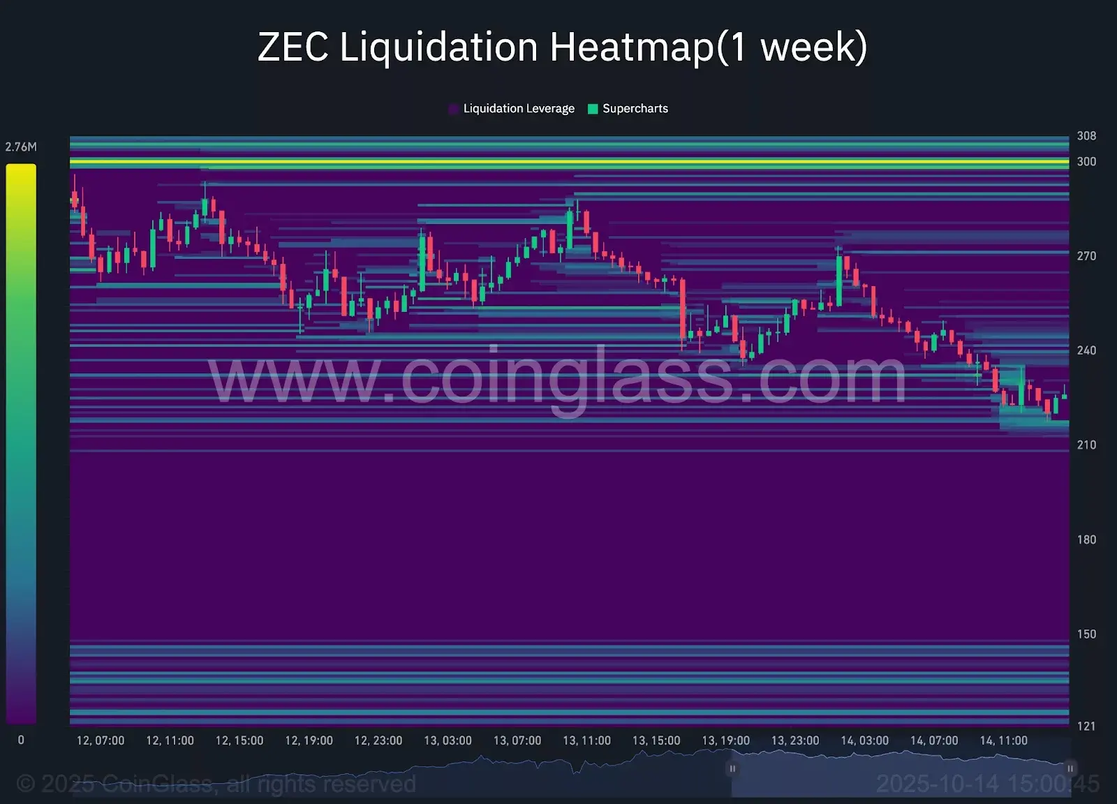 بر اساس نقشه حرارتی لیکوئیدیشن هفتگی، منطقهای متمرکز از لیکوئیدهای لانگ در بازه ۲۰۰ تا ۲۱۰ دلار قرار دارد، که نشان میدهد خریداران ممکن است تلاش کنند از این ناحیه دفاع کنند تا از تشدید روند نزولی جلوگیری کنند. این ناحیه همزمان با خط روند حمایت نزولی در نمودار روزانه است و بر اهمیت کوتاهمدت آن به عنوان کف بازار تأکید میکند.
