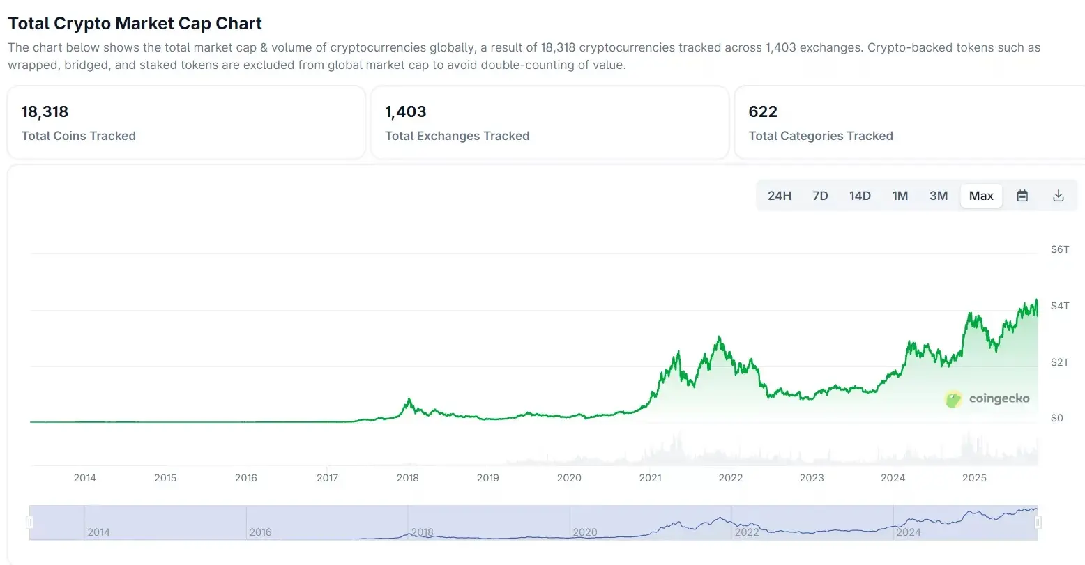 در روز ۱۴ اکتبر، بازار رمزارزها شاهد یک کاهش قابل توجه بود، بهطوریکه ارزش کل بازار از مرز ۴ تریلیون دلار عبور کرد و به حدود ۳.۸ تریلیون دلار کاهش یافت. این افت ارزش حدود ۴ درصد را نشان میدهد و نتیجه آن، کاهش قیمت عمدهترین توکنها نظیر بیتکوین، اتریوم و ریپل (XRP) همزمان بود.