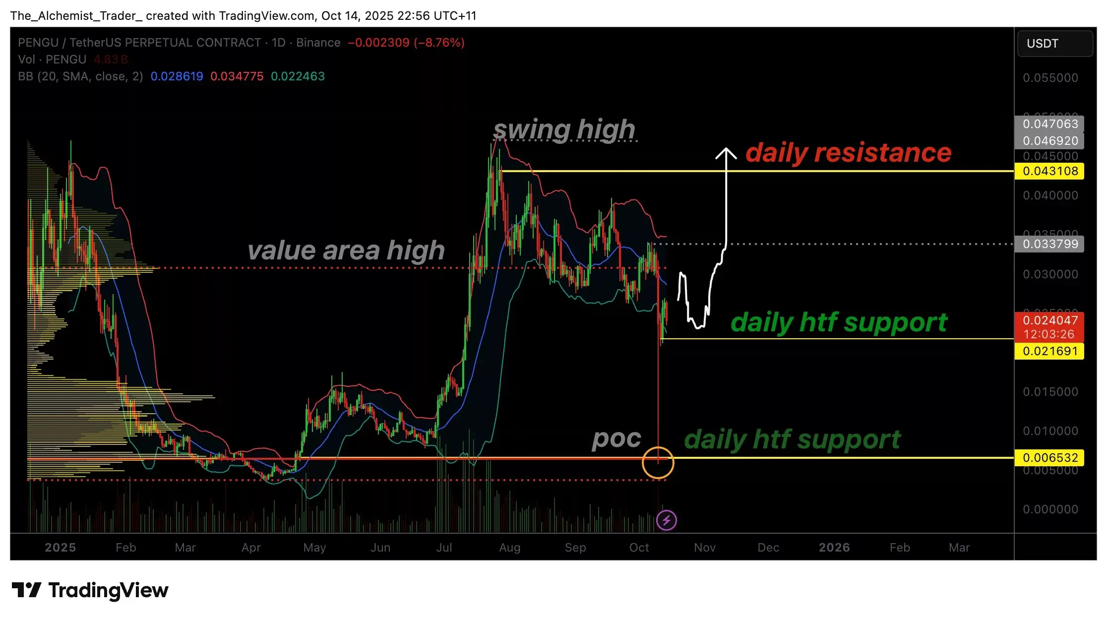 در چند روز اخیر، نوسانات قیمت پنگو بسیار شدید بوده است، اما حفظ سطح حمایتی ۰.۰۲۱ دلار نقش حیاتی در ایجاد زمینه برای بازیابی احتمالی بازار ایفا کرده است. پس از یک دوره فروش سنگین و فشار عرضه گسترده، بازار با تقاضای قابل توجهی در ناحیه کنترل قیمت (POC) که همراستا با حمایت روزانه است، مواجه شده است.