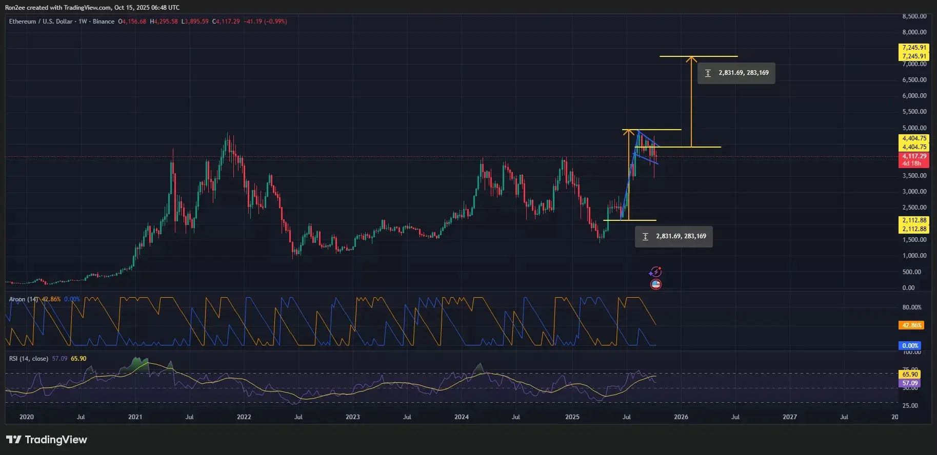 در حالی که احساس احتیاط در بازار کریپتو غالب است، عملکرد قیمتی اتریوم در نمودار هفتگی نشانگر تصویر متفاوتی است. از نظر فنی، به نظر میرسد که ETH در حال شکلگیری یک الگوی بسیار صعودی است که در صورت تایید، میتواند مسیر را به سمت ثبت رکورد جدید هموار کند.