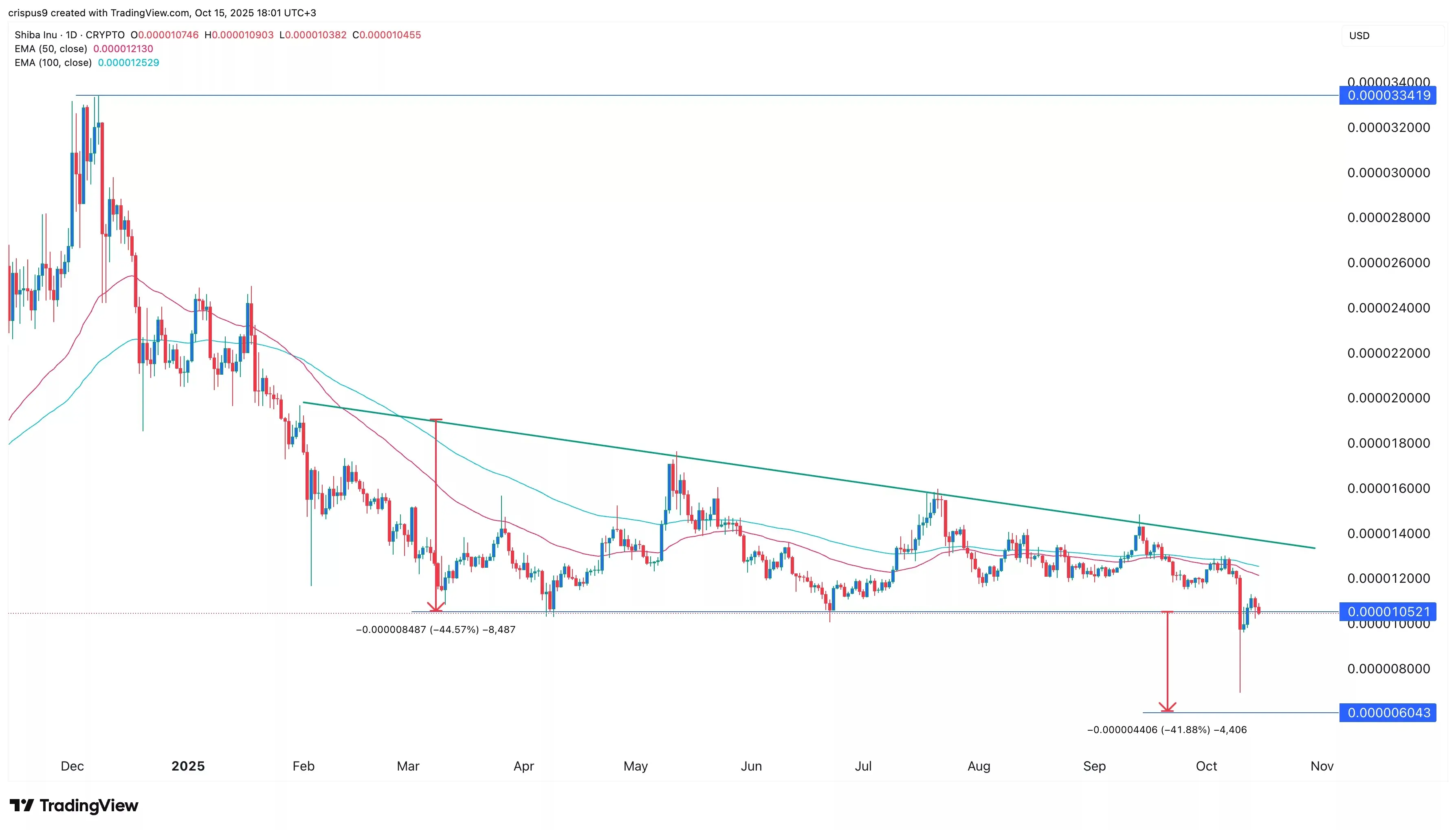 نمودار تایم فریم روزانه نشان میدهد که قیمت شیبا اینو (Shiba Inu) در سال جاری در روند نزولی قرار دارد. در حال حاضر، الگوی مثلث کاهشی (descending triangle) شکل گرفته است که کف آن در سطح ۰.۰۰۰۰۱۰۵۲ دلار قرار دارد؛ این پایینترین سطح در ماههای آوریل و ژوئن امسال است. خط بالایی این الگو، سقف بالاترین نوسانهای از فوریه تاکنون را به هم متصل میکند.