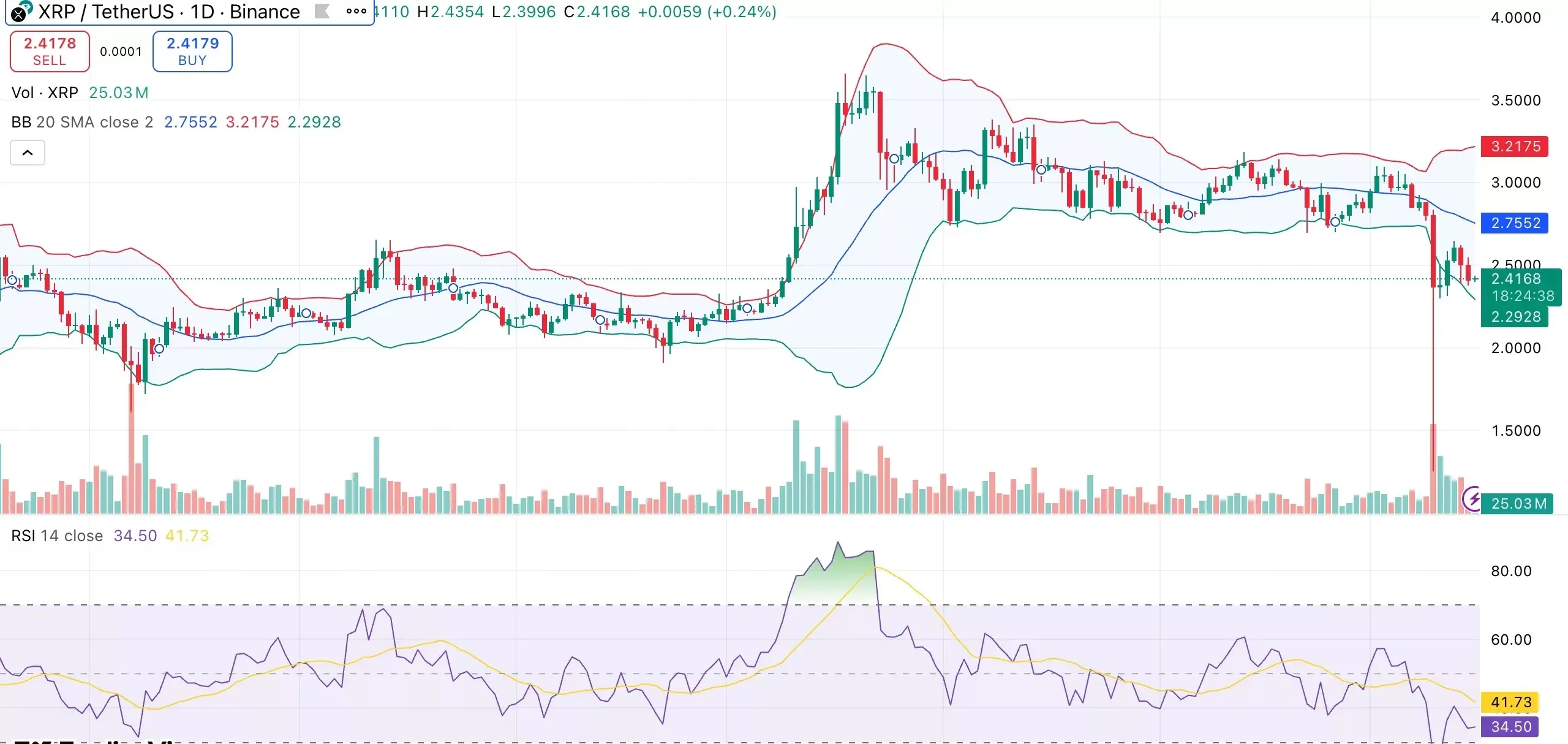 ساختار فنی ریپل (XRP) نشاندهنده آغاز مرحلهای محتاطانه است. قیمت این رمزارز با کاهش زیر میانگینهای متحرک اصلی (10 تا 200 روزه) نشان داد که فشارهای نزولی کوتاهمدت بر بازار غالب شده است. نوارهای بولینگر (Bollinger Bands) نیز در حال گسترش هستند که این امر نشاندهنده افزایش نوسانپذیری است. در حال حاضر، XRP در نزدیکی نوار پایینی بولینگر و در حدود ۲.۲۹ دلار معامله میشود که به عنوان حمایت فوری عمل میکند.