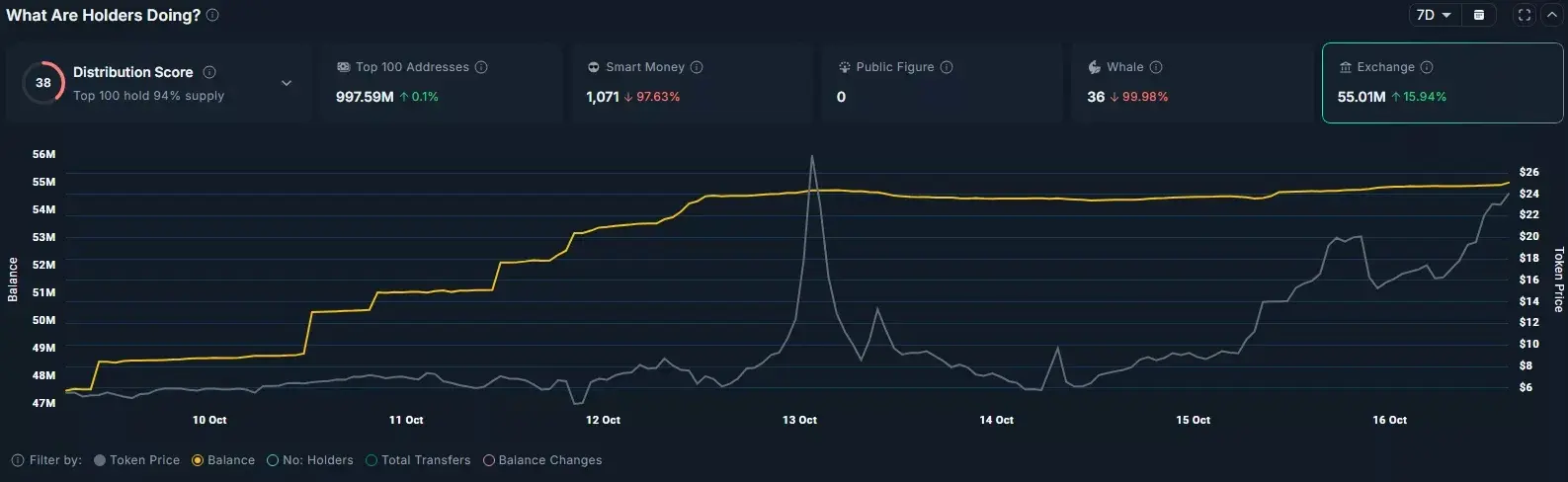 از سوی دیگر، دادههای زنجیرهای ارائه شده توسط نانسَن (Nansen) هشدارهایی را برای فعالان بازار به همراه دارد. در این دادهها، افزایش موجودی توکنهای COAI در صرافیهای متمرکز از ۴۷.۴۸ میلیون به ۵۵ میلیون توکن در طول هفت روز گذشته مشاهده میشود. این روند میتواند نشاندهنده تمایل بخشی از سرمایهگذاران به فروش یا جابهجایی داراییهای خود به دیگر آلتکوینها باشد.