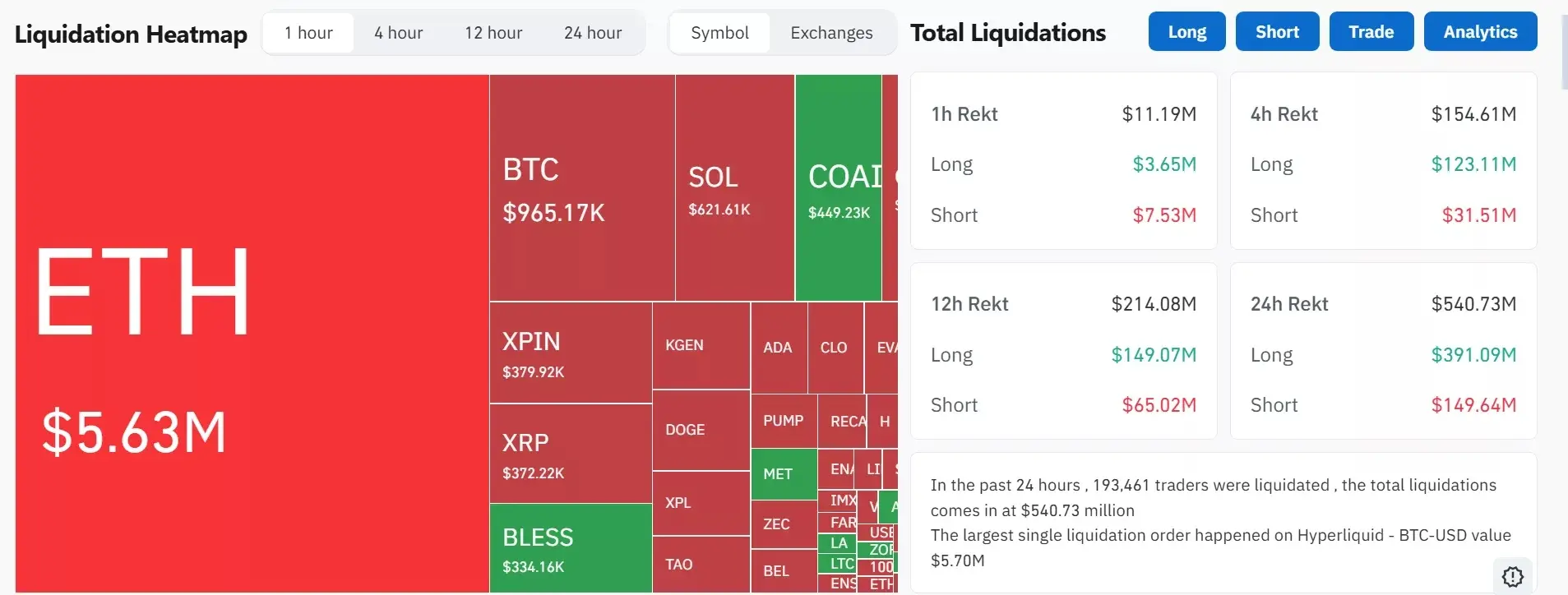 در این میان، اتریوم (اتریوم) با بیش از ۵.۶۳ میلیون دلار لیکوئیداسیون در صدر قرار دارد، و بیتکوین (Bitcoin) با نزدیک به یک میلیون دلار در جایگاه بعدی است. دیگر آلتکوینهایی مانند سولانا (Solana) نیز با ضررهای قابل توجه مواجه شدهاند؛ سولانا حدود ۶۲۱ هزار دلار در لیکوئیداسیونها از دست داده است، در حالی که مجموع ضررهای سایر آلتکوینها به بیش از ۴۴۹ هزار دلار میرسد.