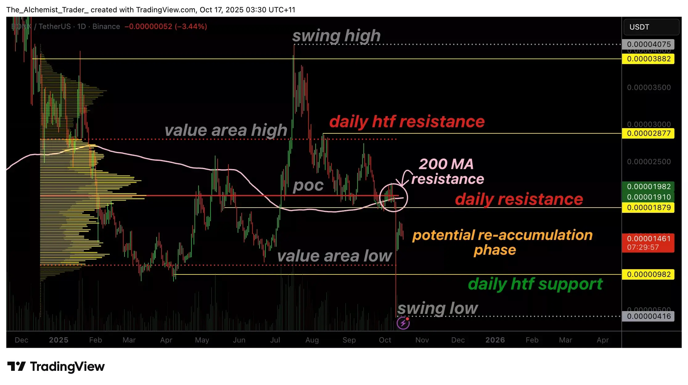 قیمت توکن بونک (Bonk) در حال حاضر پایینتر از میانگین متحرک ۲۰۰ روزه خود معامله میشود، سطحی که اغلب نقش خط تفکیک بین ادامه روند صعودی و شروع روند نزولی را ایفا میکند. همپوشانی این میانگین با مقاومت روزانه در حوالی نقطه کنترل، منطقهای قوی برای رد قیمت ایجاد کرده است. در تاریخ بازار، چنین نواحی معمولاً به عنوان مقاومتهای سنگین شناخته میشوند که در آنها حرکت قیمت یا متوقف میشود یا معکوس میخورد، بدون آنکه حجم معاملات به طور قابلتوجهی افزایش یابد.