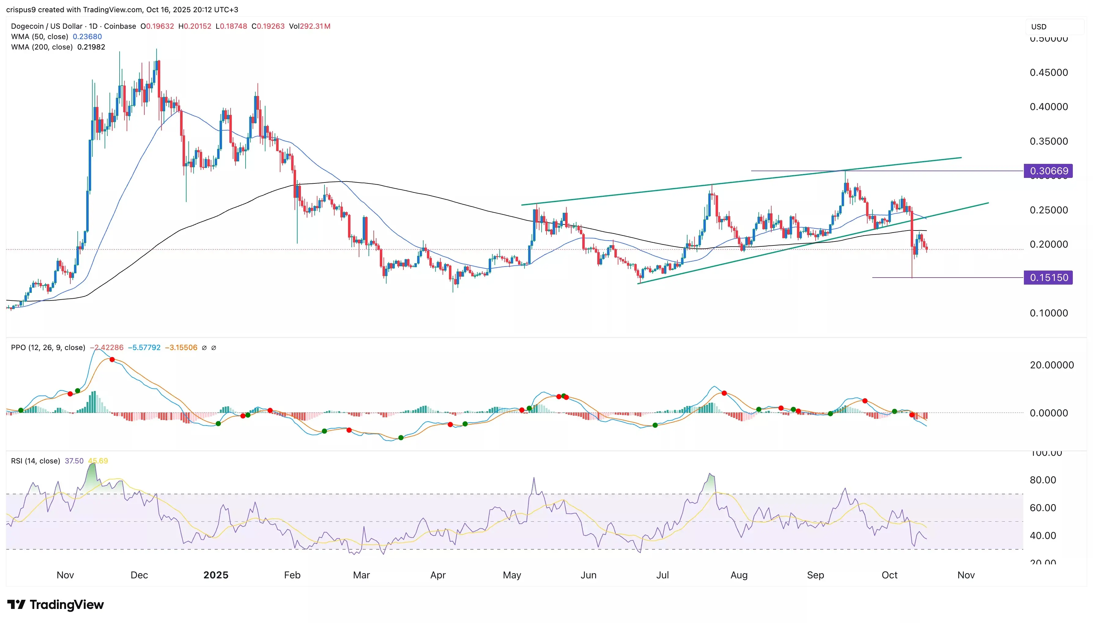 بر اساس تحلیل نمودارهای روزانه، قیمت دوجکوین در چند روز گذشته با کاهش قابل توجهی مواجه شده است. این کاهش قیمت در پی شکلگیری الگوی کناری قوی و بسیار نزولی از نوع wedge (گوشهدار) صورت گرفت که از دو خط روند همگرا و صعودی تشکیل شده است.