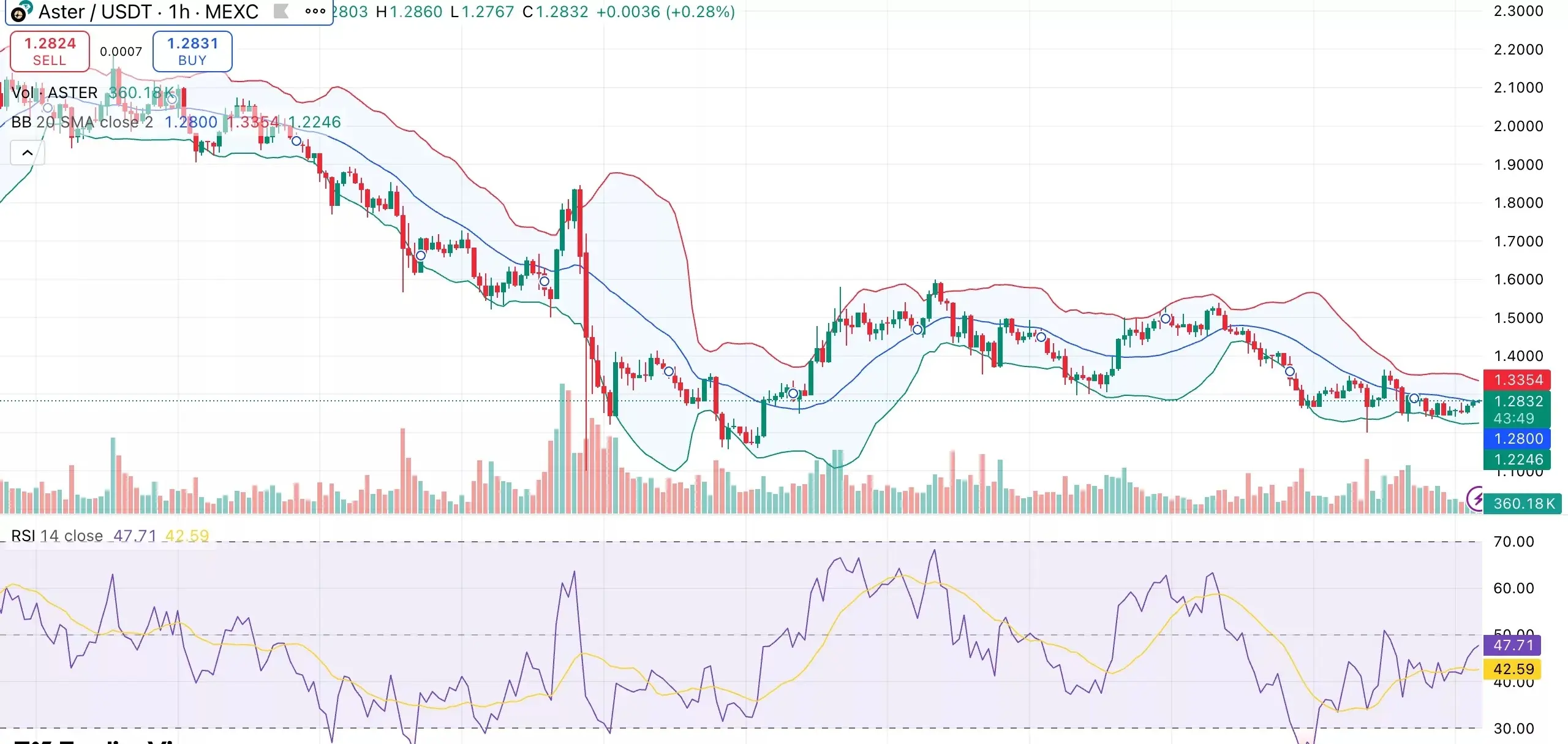 در نمودار یکساعته، رمزارز آستر (Aster) در محدودهای محدود و نزدیک به سطح ۱.۲۸ دلار معامله میشود، جایی که قیمت در نزدیکی باند پایین باند بولینگر قرار دارد. پس از چند روز کاهش قیمت، شاخص قدرت نسبی (RSI) که در حال حاضر در سطح ۴۸ قرار دارد، نشاندهنده تعادل نسبی در حرکت بازار است. این وضعیت نشان میدهد که رمزارز مذکور در وضعیت خنثی قرار دارد و احتمالاً در انتظار روند جدید است.