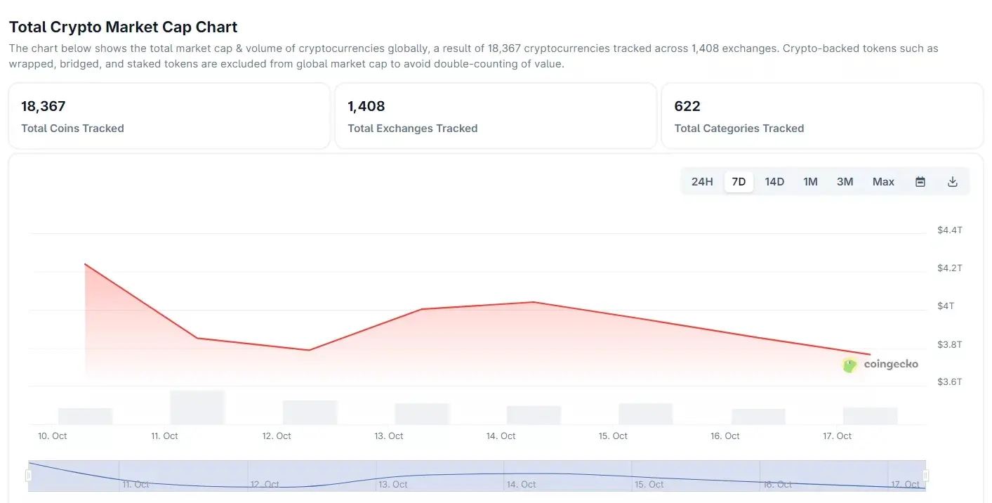 بازار رمزارزها در روز ۱۷ اکتبر شاهد یکی از شدیدترین ریزشهای خود بود، به طوری که ارزش کل بازار با کاهش ۷.۳ درصدی به حدود ۳.۶ تریلیون دلار رسید. این کاهش سریع و قابل توجه، بازار را در وضعیت ناپایدار قرار داده است، چرا که تنها در هفته گذشته ارزش بازار زیر ۴ تریلیون دلار سقوط کرده بود و اکنون نزدیک به ۳.۵ تریلیون دلار است.