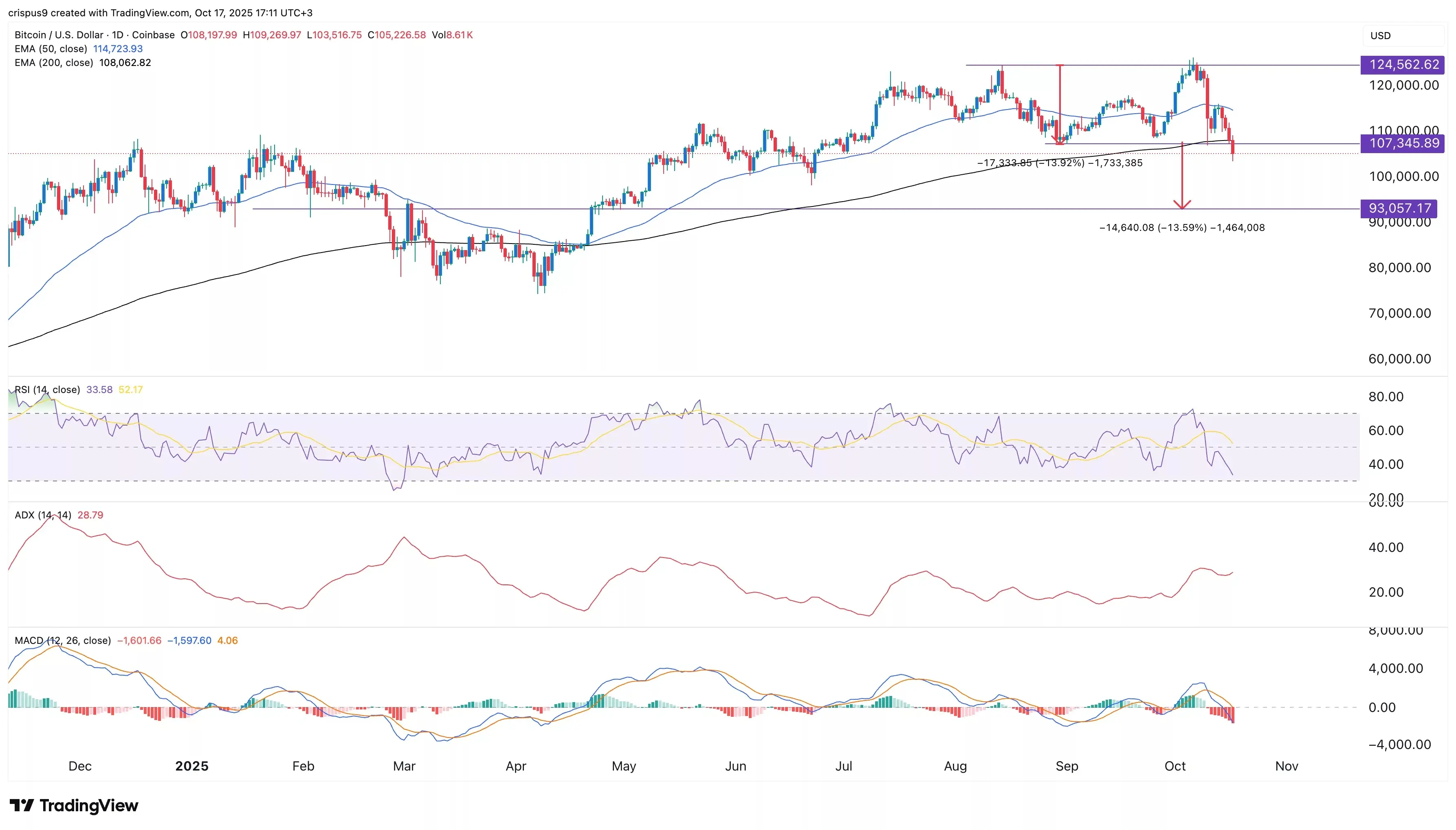 بر اساس تحلیلهای فنی، احتمال کاهش بیشتر قیمت بیتکوین وجود دارد. در نمودار روزانه، الگوی دو قله (دو تاپ) تشکیل شده و در نمودار هفتگی، یک wedge صعودی بزرگ دیده میشود که نشاندهنده احتمال ریزش قیمت به زیر ۱۰۰ هزار دلار در صورت افزایش ریسکهای بازار است.