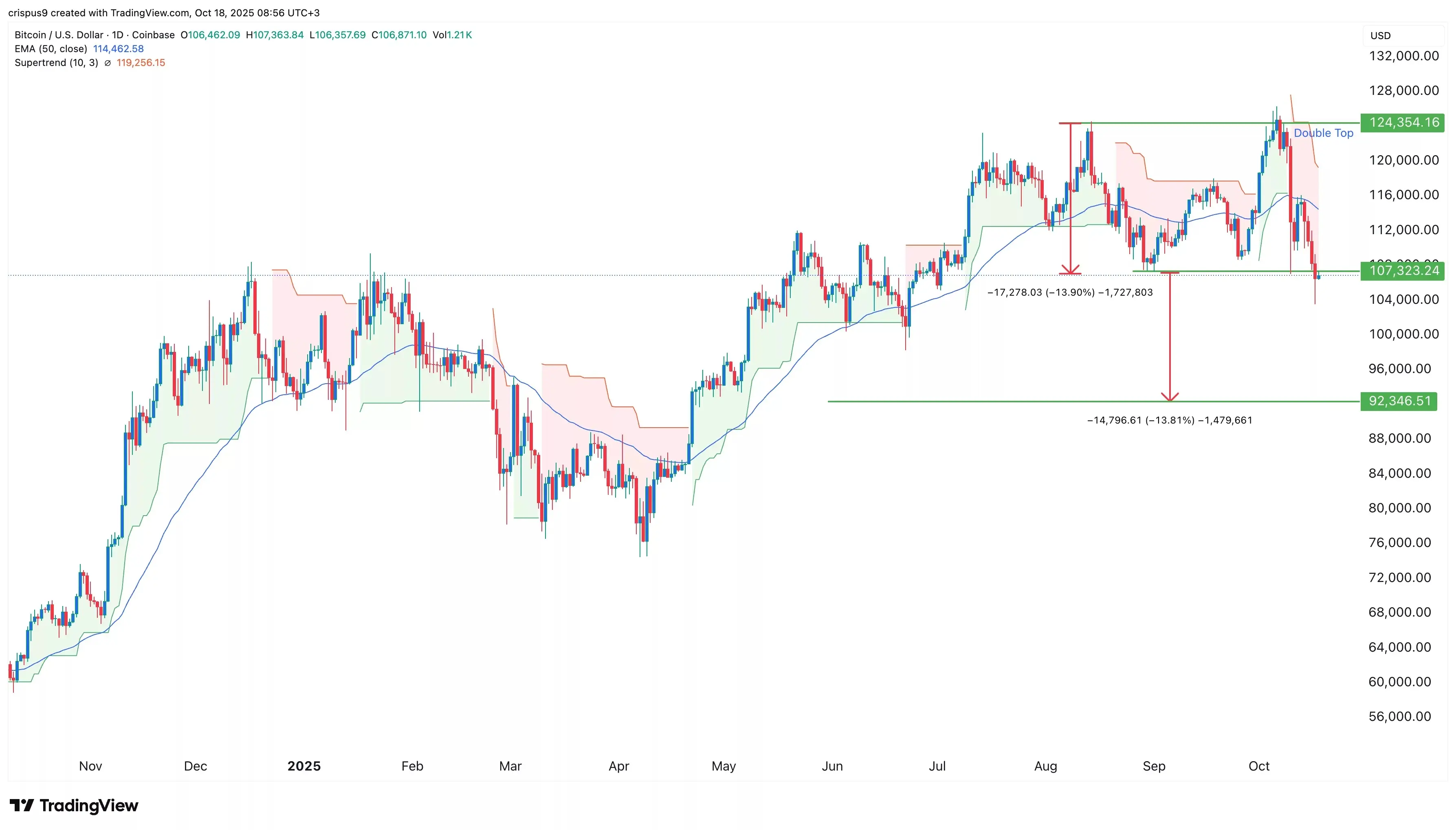 نمودار تایمفریم روزانه نشان میدهد که قیمت بیتکوین (BTC) پس از کاهش ۱۴ درصدی از بالاترین سطح سال جاری، همچنان تحت فشار فروش قرار دارد. این روند منجر به سقوط قیمت زیر میانگین متحرک ۵۰ روزه شده است، و شاخص سوپرترید (Supertrend) نیز به رنگ قرمز تغییر یافته است که نشانگر ادامه روند نزولی است.