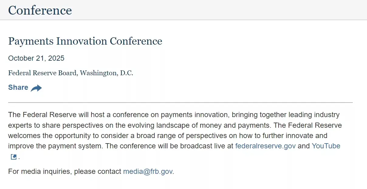 در تاریخ ۲۱ اکتبر، فدرال رزرو آمریکا میزبان کنفرانسی خواهد بود که موضوعاتی چون استیبلکوینها، هوش مصنوعی، پرداختهای رمزارزی و سایر فناوریهای نوین مالی را در برمیگیرد. این رویداد با عنوان «کنفرانس نوآوری در پرداختها» برگزار میشود و قرار است جمعی از کارشناسان برجسته حوزه دیفای و رمزارز در آن حضور یابند تا با مقامات بانک مرکزی درباره تحولات و چالشهای بازارهای مالی گفتگو کنند.