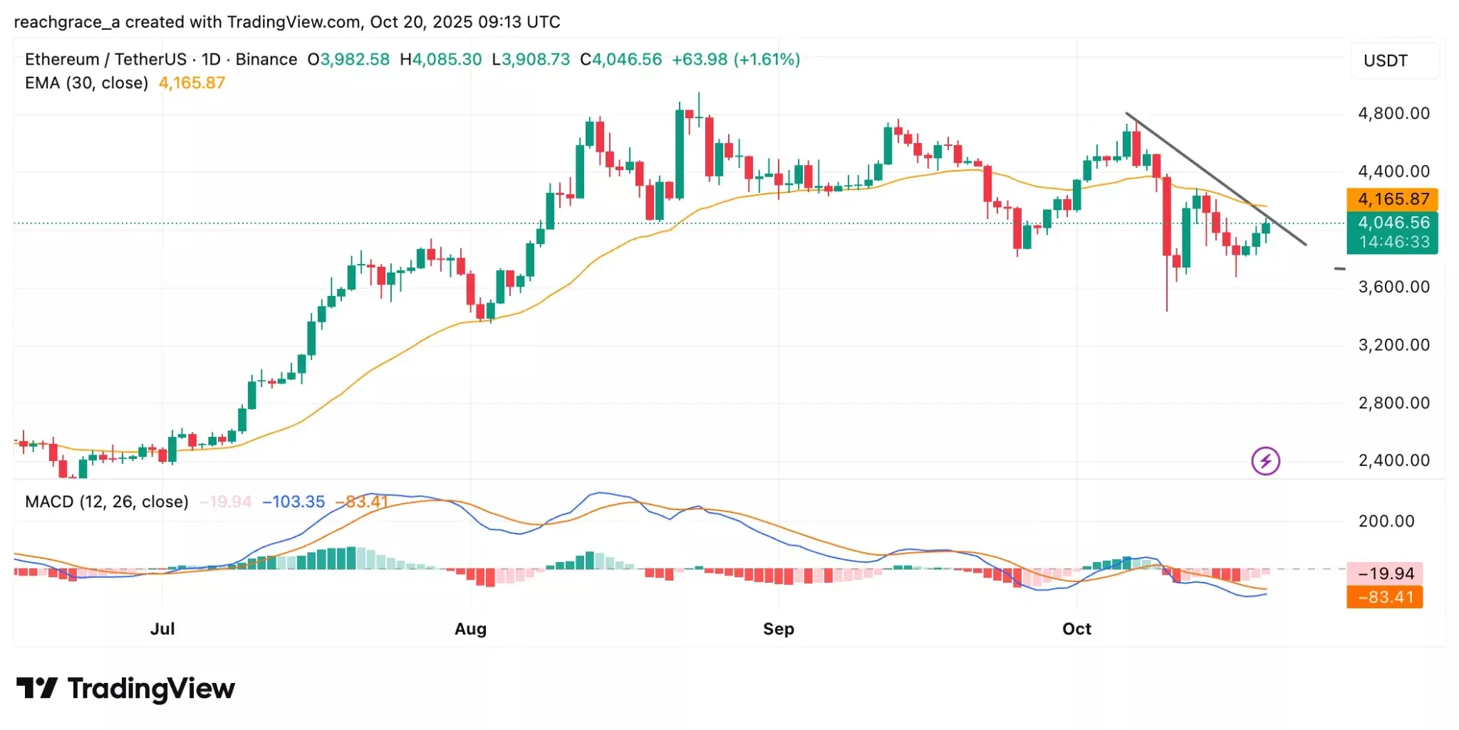 نمودار روزانه اتریوم (ETH) نشاندهنده یک بازگشت اخیر پس از چند هفته دشوار است. قیمت این رمزارز از منطقه حمایتی ۳۸۰۰ تا ۳۸۵۰ دلار جهش کرده و مجدداً بالای سطح روانی ۴۰۰۰ دلار قرار گرفته است. تلاش برای شکست خط روند نزولی کوتاهمدت نیز نشان میدهد که ممکن است نشانههایی از تغییر جهت روند در حال شکلگیری باشد.