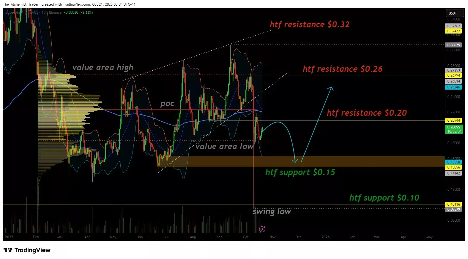 ناحیه ۰.۱۵ دلار به عنوان حمایت کلیدی در تایمفریمهای بلندمدت محسوب میشود که هنوز آزمایش نشده است. شکست و آزمون مجدد این سطح میتواند سرآغاز شروع تجمع ( accumulation) باشد و مشخص کند که آیا روند صعودی جدید شکل میگیرد یا خیر.