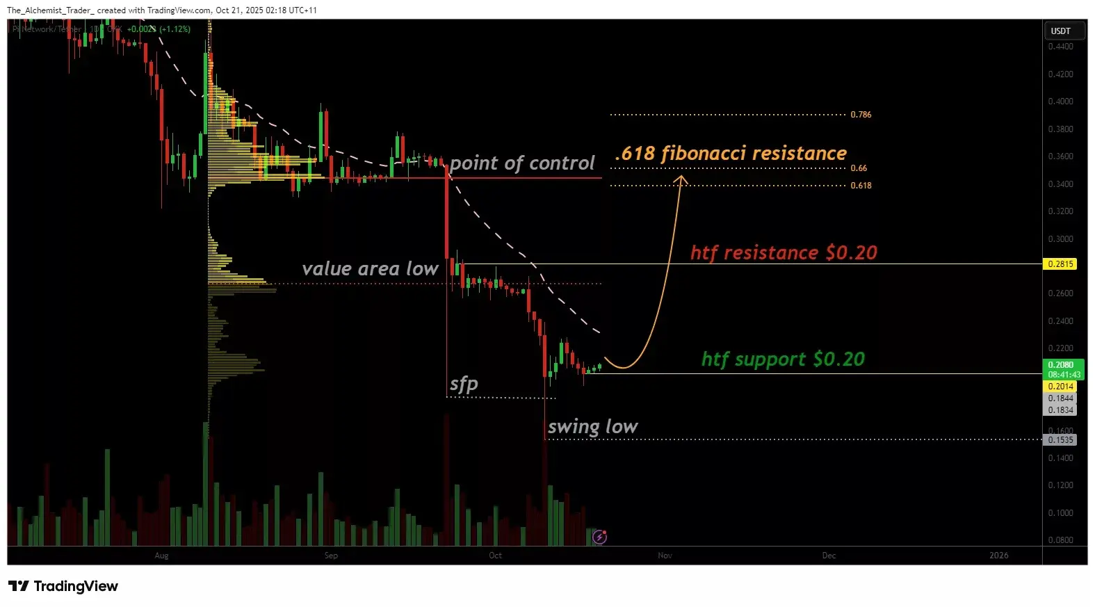 بازپسگیری موفق این مقاومت، نقطه کنترل (POC) را به عنوان هدف بعدی در جهت تحلیلهای فنی قرار میدهد که همزمان با سطح ۰.۶۱۸ فیبوناچی ریترسمنت است. اگر قیمت بتواند به سمت این ناحیه حرکت کند و حفظ momentum داشته باشد، این امر نشان میدهد که سطح ۰.۲ دلار به عنوان کف بازار تثبیت شده است.
