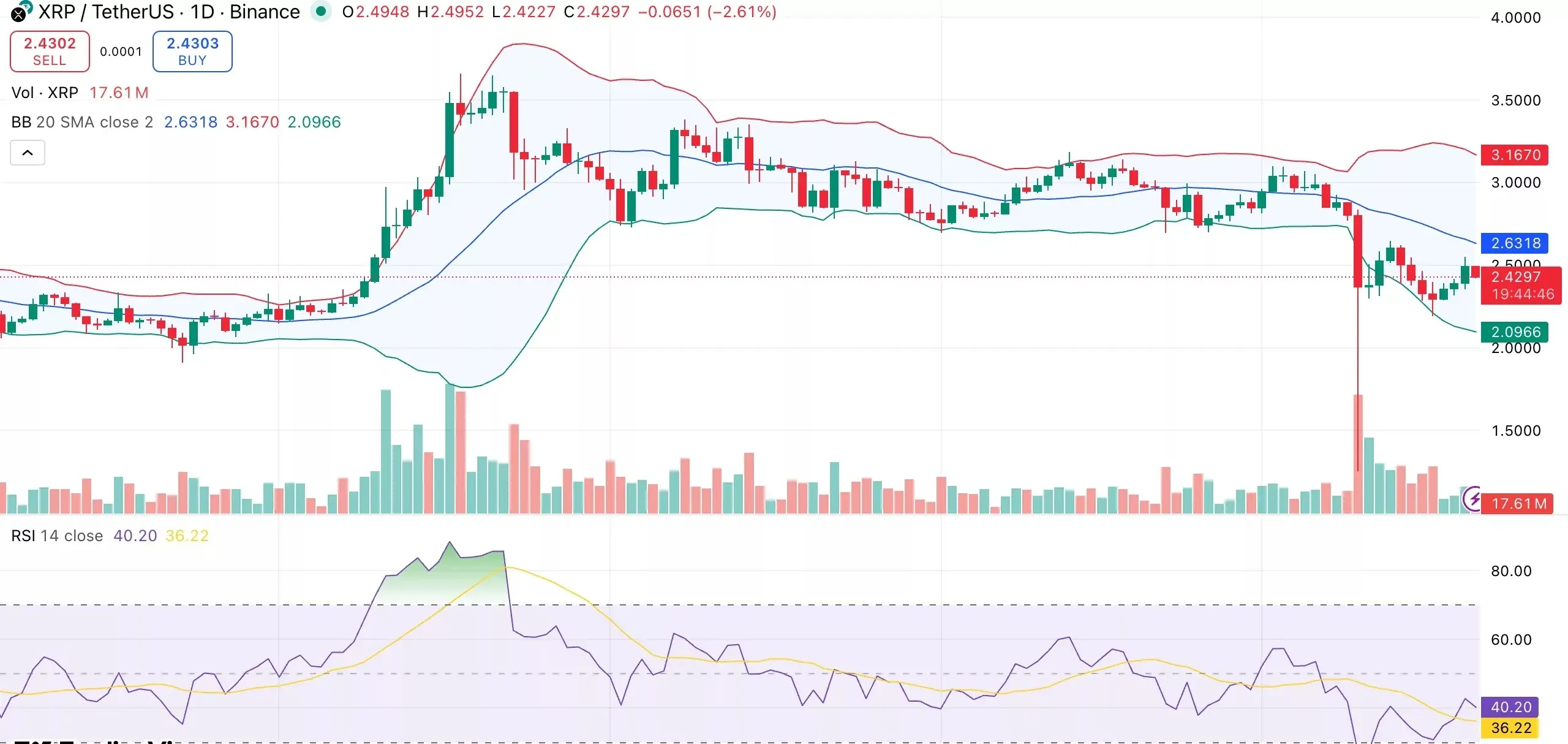 ایکسآرپی (XRP) در حال حاضر در نمودار روزانه به سطح حمایت کوتاهمدت نزدیک شده است و در نزدیکی نوار پایین بولینگر بند قرار دارد. در صورت مداخله خریداران، احتمال یک واکنش صعودی وجود دارد، چراکه شاخص قدرت نسبی (RSI) در سطح ۳۹.۹ قرار گرفته است و نشاندهنده فشار فروش ملایم اما هنوز عدم اشباع فروش است. این وضعیت نشان میدهد که بازار ممکن است در صورت ادامهی حمایتها، وارد روند بازیابی شود.
