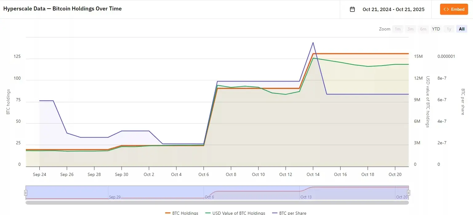 بر اساس دادههای سایت بیتکوین ترژری (Bitcoin Treasuries)، هایپراسکیل دیتای تنها طی کمتر از یک ماه شروع به خرید بیتکوین کرده است. این شرکت در تاریخ ۲۳ سپتامبر امسال وارد فرآیند نگهداری BTC شد و تاکنون مالک ۱۳۰.۸ بیتکوین است که معادل حدود ۱۴ میلیون و ۱۸۰ هزار دلار است. با در نظر گرفتن میانگین قیمت خرید هر بیتکوین حدود ۱۱۵ هزار و ۴۶۰ دلار، این شرکت پس از کاهش قیمت بیتکوین زیر ۱۱۰ هزار دلار، با ضرری حدود ۶.۰۲ درصد مواجه شده است.