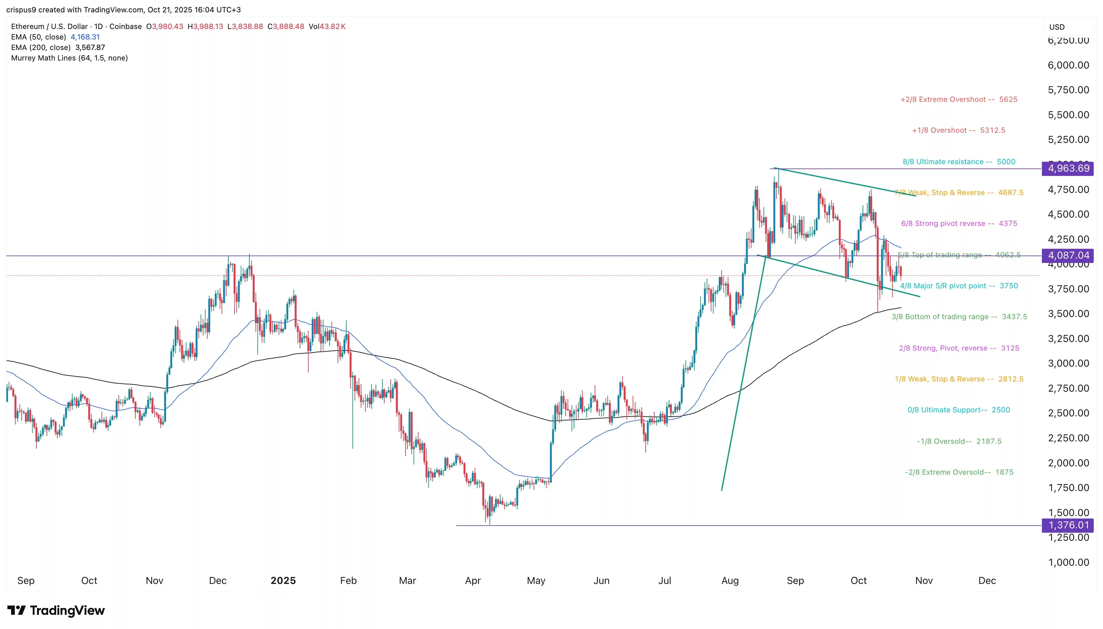 قیمت اتریوم (Ethereum) در هفته جاری تحت فشار فزایندهای قرار گرفت، همزمان با افزایش خروج سرمایه از صندوقهای قابل معامله در بورس (ETF) و تضعیف نگرش عمومی در بازار رمزارزها. در زمان نگارش این گزارش، قیمت اتریوم در حدود ۳۹۰۰ دلار قرار داشت که نسبت به اوج ماه سپتامبر بیش از ۲۱ درصد کاهش یافته است.