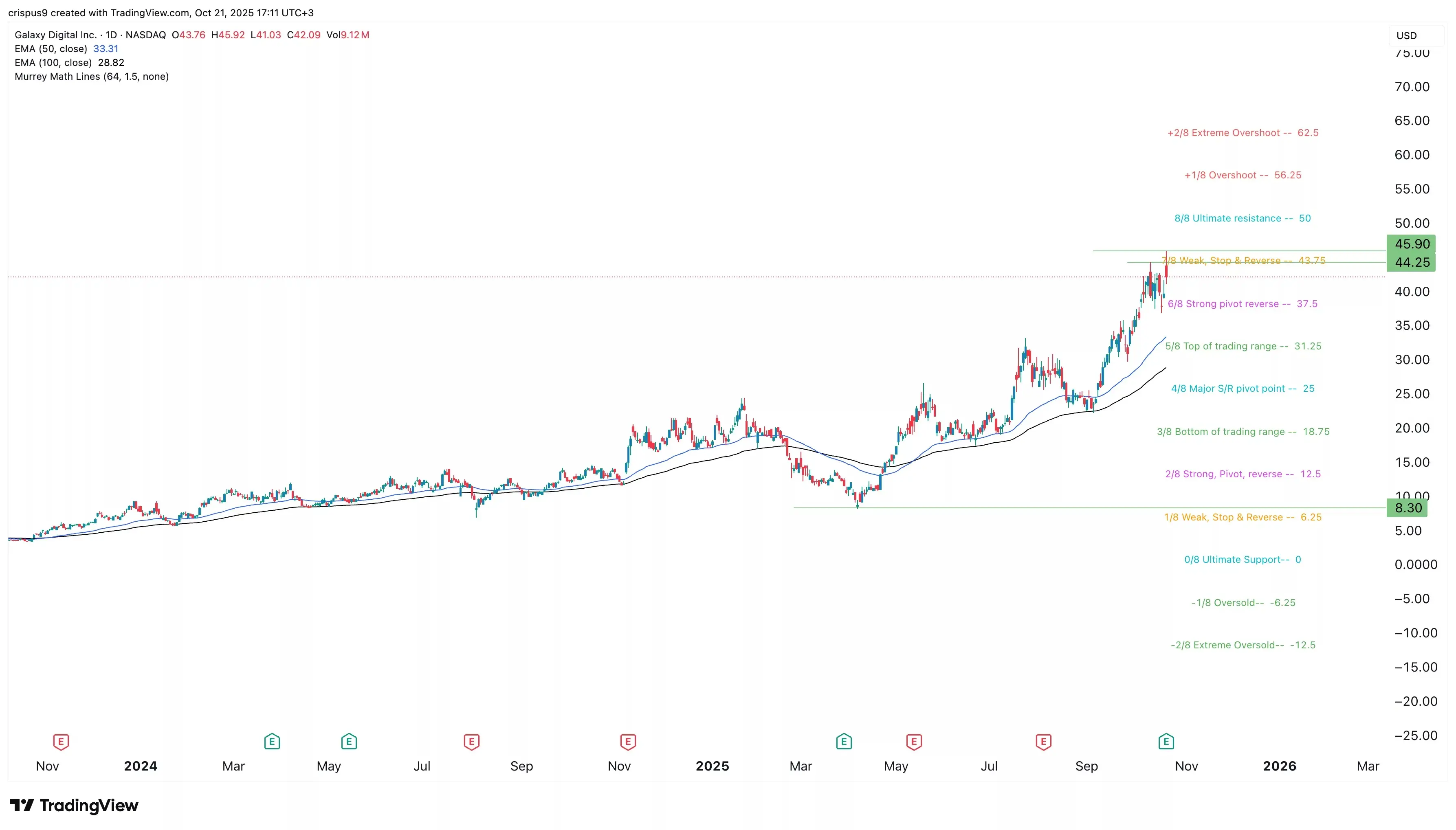 در نمودار روزانه، روند صعودی قوی سهام گلکسی (GLXY) در چند ماه اخیر به وضوح قابل مشاهده است. قیمت این سهم از کف ۸.۳۰ دلار در آوریل به رکورد تاریخی ۴۵.۹۰ دلار پس از اعلام درآمدها رسیده است.