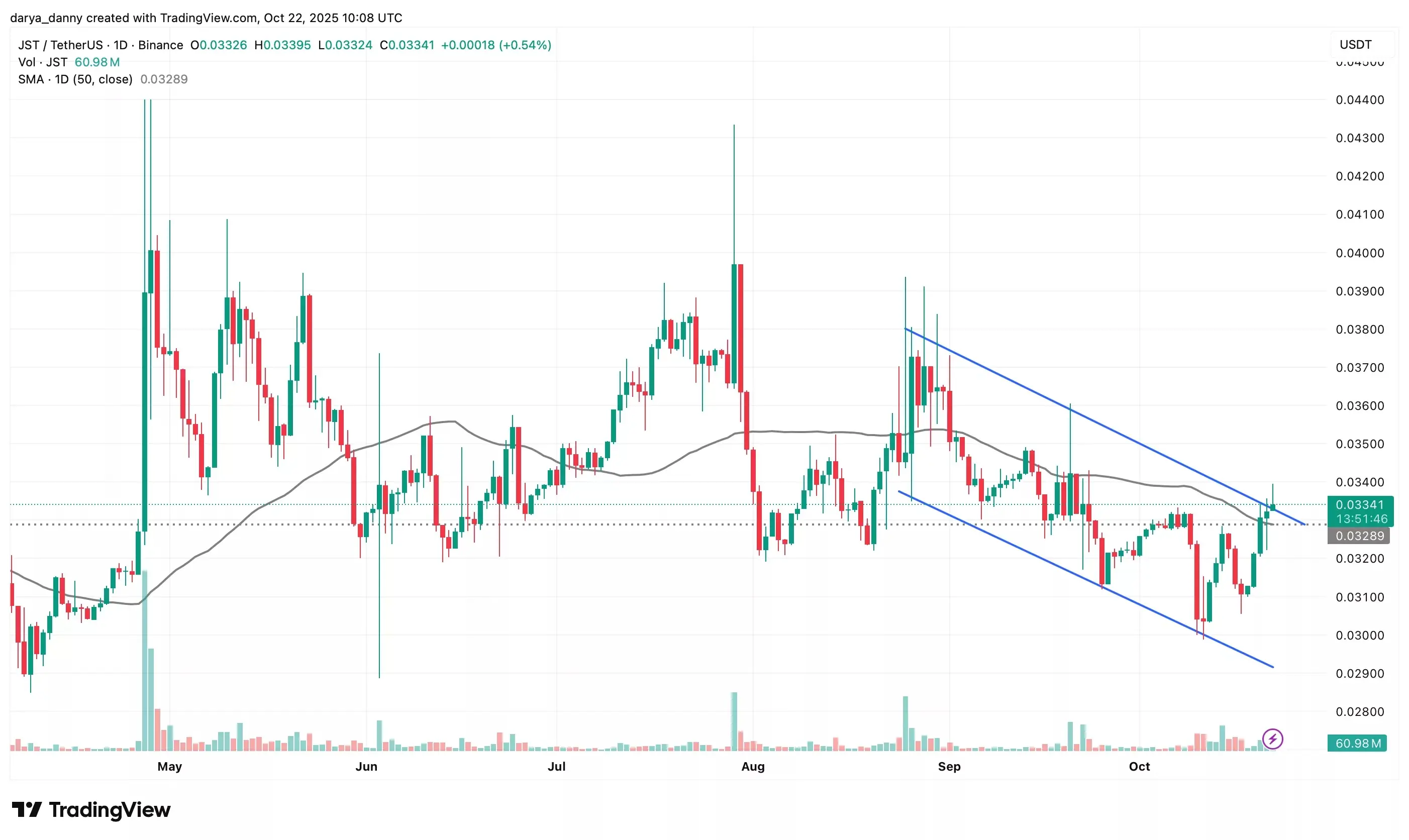 بازخرید و سوزاندن توکنهای JST ممکن است نقطه عطفی برای این رمزارز باشد، چرا که در ماههای اخیر روند نزولی ثابتی را تجربه کرده است. قیمت این توکن در اواسط اوت تلاش کرد تا از الگوی دوجی پایین (double-bottom) برگشت کند، اما نتوانست و پس از آن وارد کانال نزولی شد.