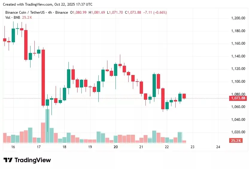 قیمت بایننس کوین (BNB) در حال حاضر در نزدیکی ۱۰۷۶ دلار قرار دارد و طی ۲۴ ساعت گذشته حدود ۱.۵ درصد کاهش یافته است.