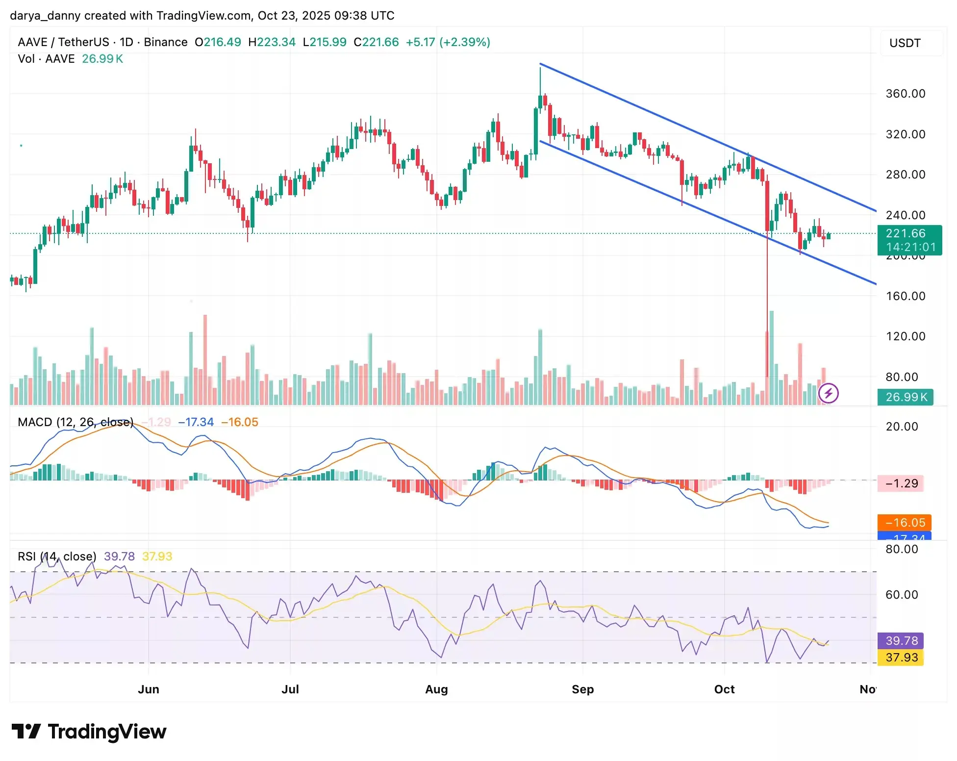 قیمت آو (Aave) همچنان روند کاهشی خود را ادامه میدهد و در قالب کانال نزولی که از اوت (آگوست) شکل گرفته، حرکت میکند. در حال حاضر، این توکن در حدود ۲۲۱ دلار معامله میشود و در نزدیکی نقطه میانی این کانال قرار دارد. شاخص RSI و MACD نشان میدهند که فشار فروش کاهش یافته است، که میتواند به شکلگیری مرحله تثبیت قبل از هرگونه حرکت صعودی یا شکست احتمالی منجر شود.
