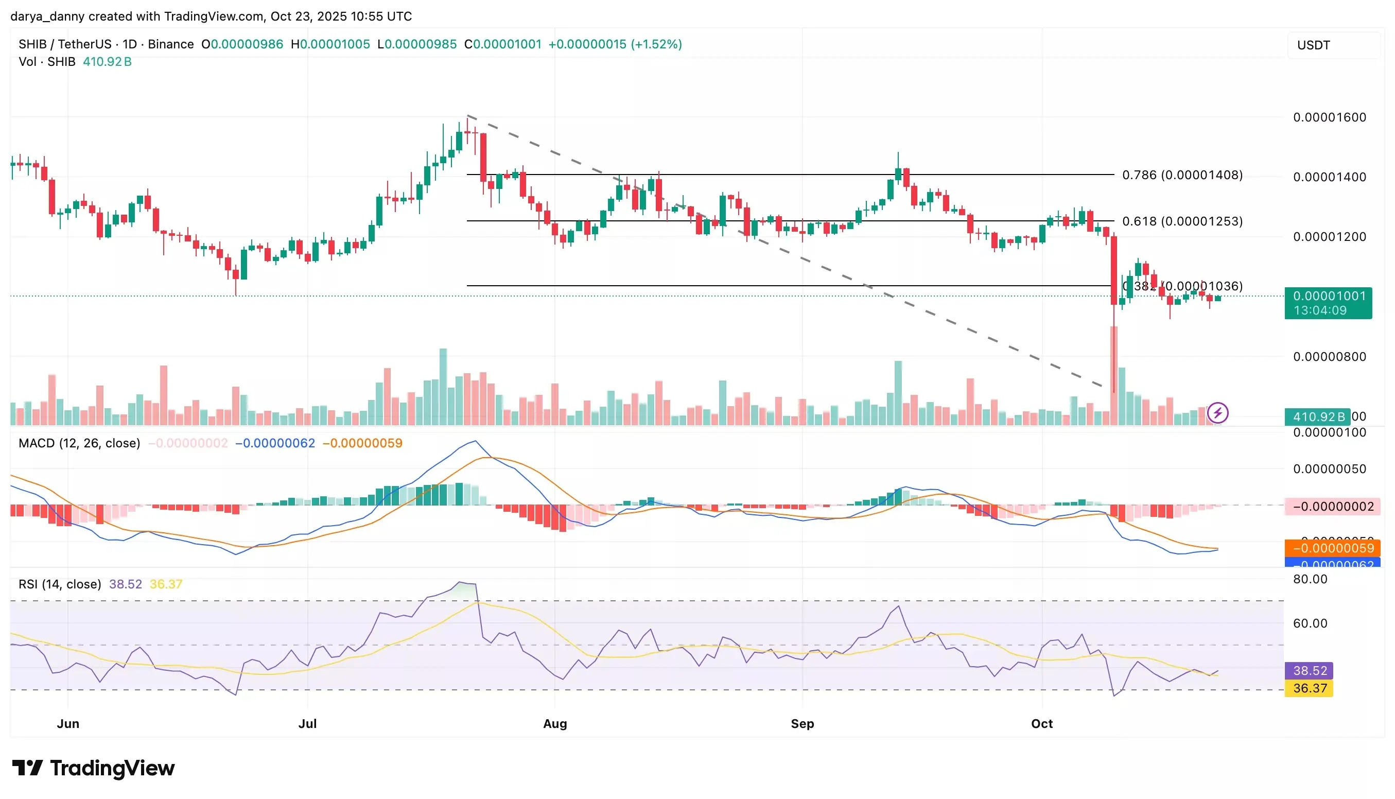 با این حال، بازار هنوز نتوانسته است نیروی خرید مداوم و قدرتمندی را نشان دهد که بتواند جهتگیری را به نفع خریداران تغییر دهد. برای تایید قدرت روند، شیبا باید بتواند بالای مقاومت قبلی در 0.00001129 دلار بسته شود، بهعلاوه حجم معاملات افزایش یابد و کراس اوور مثبت در MACD تایید شود. چنین حرکتی میتواند به تقویت احساسات مثبت و آغاز یک روند صعودی کوتاهمدت منجر شود که هدف آن ناحیه 0.0000125 دلار (فیب 0.618) است و حدود ۲۵ درصد سود نسبت به قیمت فعلی 0.00001001 دلار را در پی خواهد داشت.