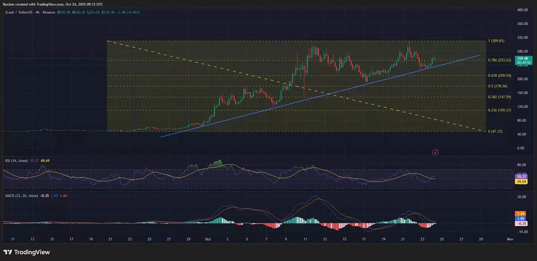قیمت زِکشِی (Zcash) پس از کاهشهای اخیر، مجدداً بالای خط روند صعودی مهمی در نمودار چهار ساعته قرار گرفت که از اواخر سپتامبر به عنوان حمایت عمل میکرد. هر بار که این سطح مورد آزمایش قرار میگرفت، معمولاً با رشد قیمتی قابل توجهی در روزهای بعد همراه بود، تا زمانی که سودگیری سرمایهگذاران روند صعودی را متوقف میکرد. این واکنشها نشاندهنده اهمیت این خط روند در تحرکات قیمتی زِکشِی است و میتواند سیگنالی برای ادامه روند صعودی در آینده نزدیک باشد.