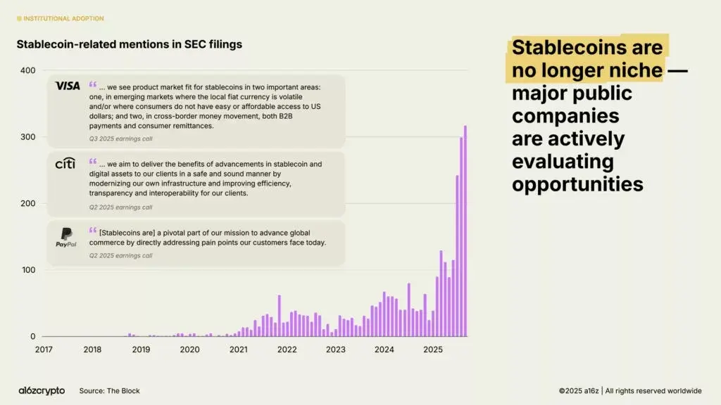 با حذف فعالیتهای غیرواقعی و غیرارگانیک، حجم تراکنشهای واقعی استیبلکوینها به حدود ۹ تریلیون دلار میرسد، رقمی که بیش از پنج برابر حجم تراکنشهای پیپال (PayPal) و بیش از نیمی از حجم تراکنشهای ویزا (Visa) است. همچنین، حجم تراکنشهای ماهانه استیبلکوینها در سپتامبر به ۱.۲۵ تریلیون دلار رسید که نشان میدهد این فعالیتها فراتر از معاملات سفتهبازانه و نوسانی است و کاربردهای واقعی در اقتصاد جهانی دارند.