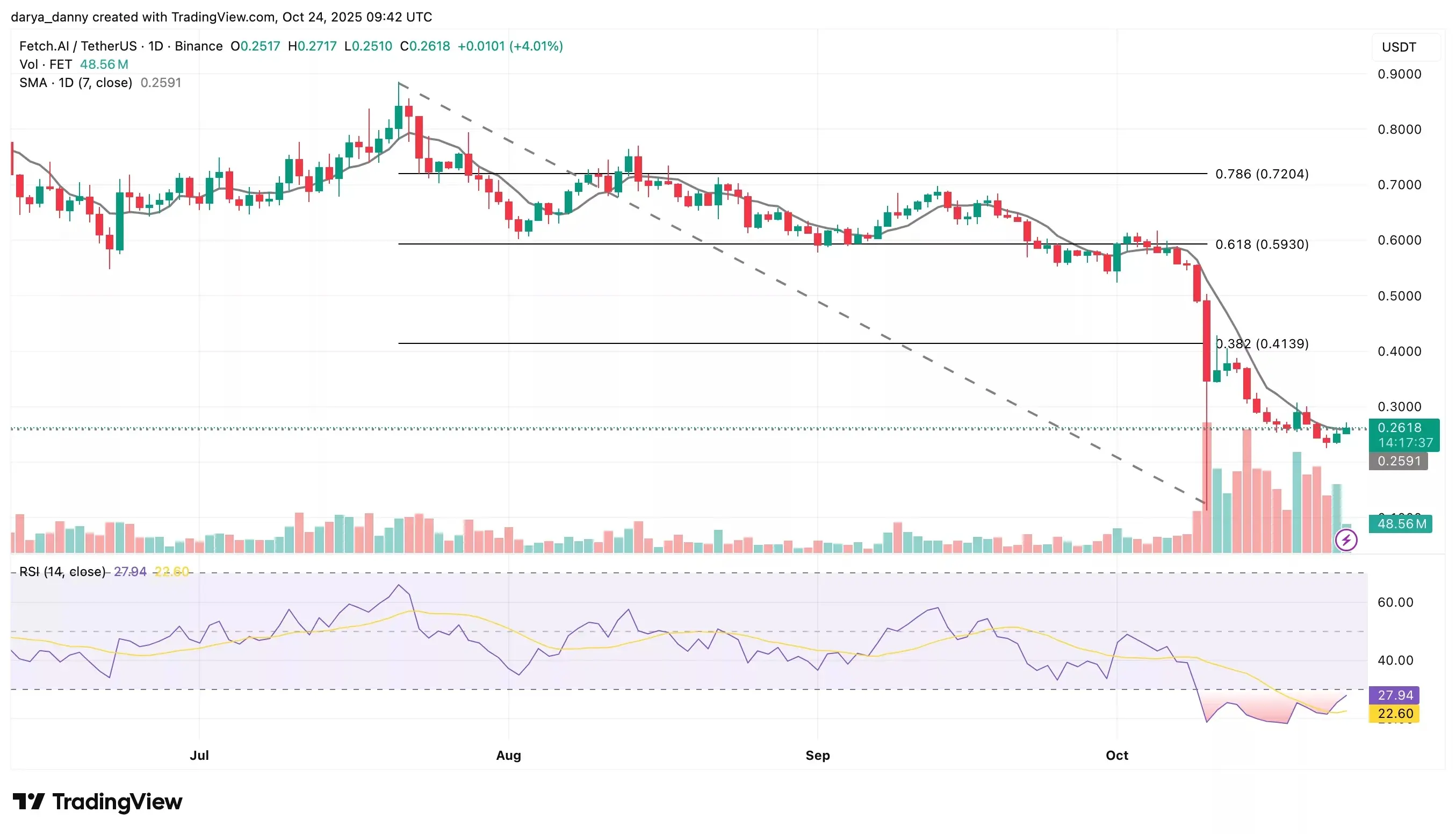 در تحلیل فنی، قیمت FET در حال ورود به مراحل اولیه بازیابی است؛ پس از برخورد به کف حدود ۰.۲۳ دلار، هماکنون در نزدیکی ۰.۲۶ دلار معامله میشود. یکی از شاخصهای مهم، تلاش برای بازپسگیری میانگین متحرک ۷ روزه است که نشان میدهد فشار کوتاهمدت فروش در حال کاهش و قدرت خریداران در حال افزایش است. شاخص RSI نیز نشان میدهد که روند نزولی در حال کاهش است؛ در حالی که قیمت اخیراً در سطح پایینتری قرار گرفته، RSI در سطحی برابر با قلههای قبلی قرار دارد و در حال حرکت به سمت بالا از ناحیه اشباع فروش (در حدود ۲۷) است، که ممکن است نشانهای از نزدیک بودن به پایان روند نزولی باشد.