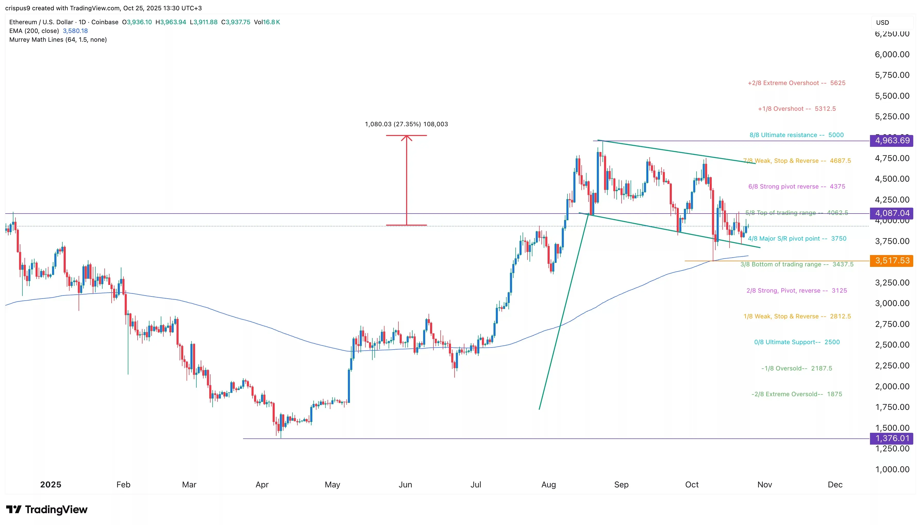 در روز شنبه، ۲۵ اکتبر، توکن اتریوم در حدود ۳،۹۳۰ دلار معامله شد که این سطح، بالاترین حد چند روز اخیر محسوب میشود و تنها چند واحد بالاتر از پایینترین قیمت ماه جاری است.