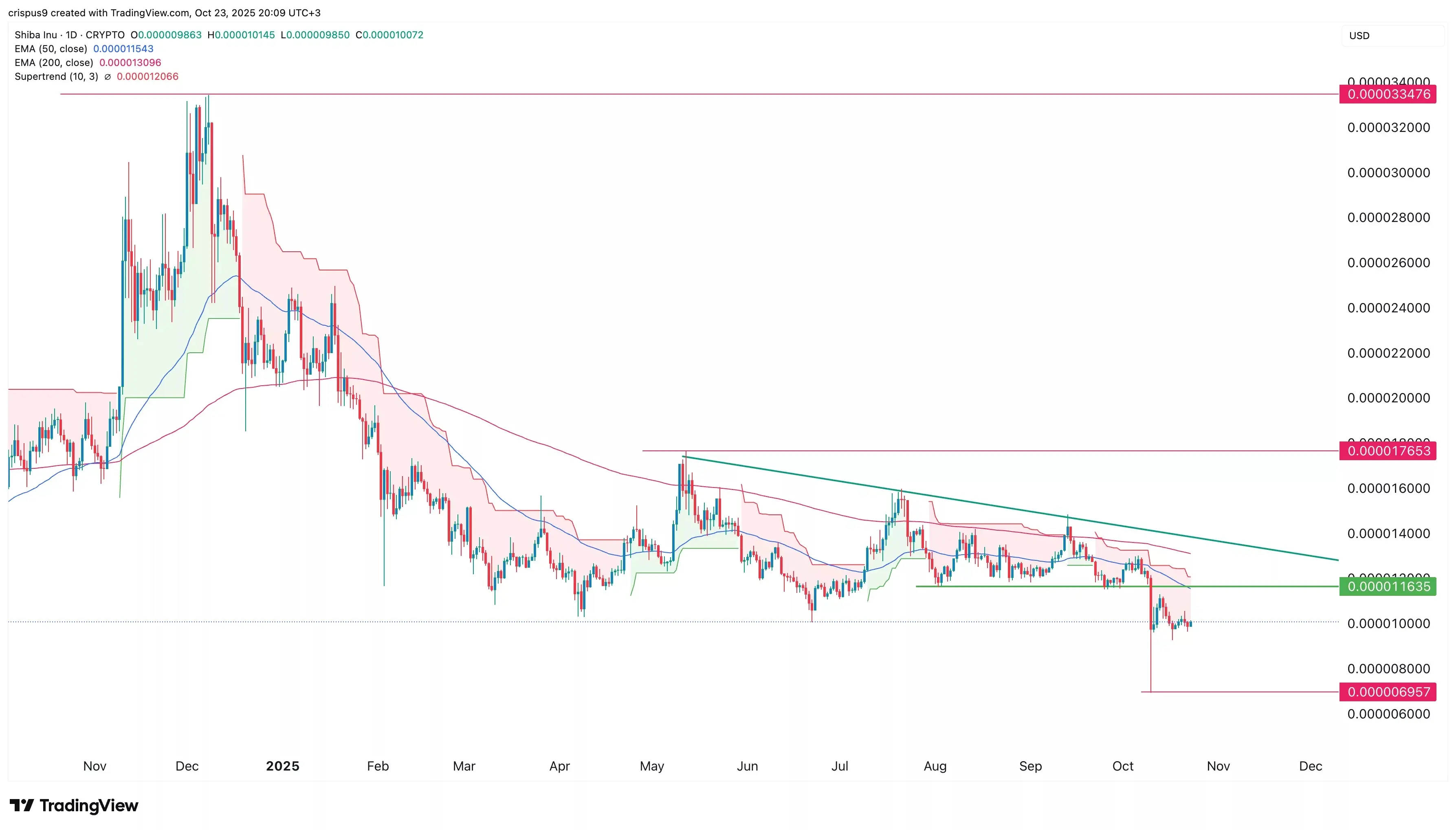 علاوه بر این، شیبا اینو در نزدیکی میانگین متحرک نمایی ۵۰ روزه و ۲۰۰ روزه قرار گرفته است، و شاخص Supertrend نیز در جهت منفی قرار دارد. شاخص قدرت نسبی (RSI) نیز در حال کاهش است، که نشاندهنده ضعف در روند خرید است.