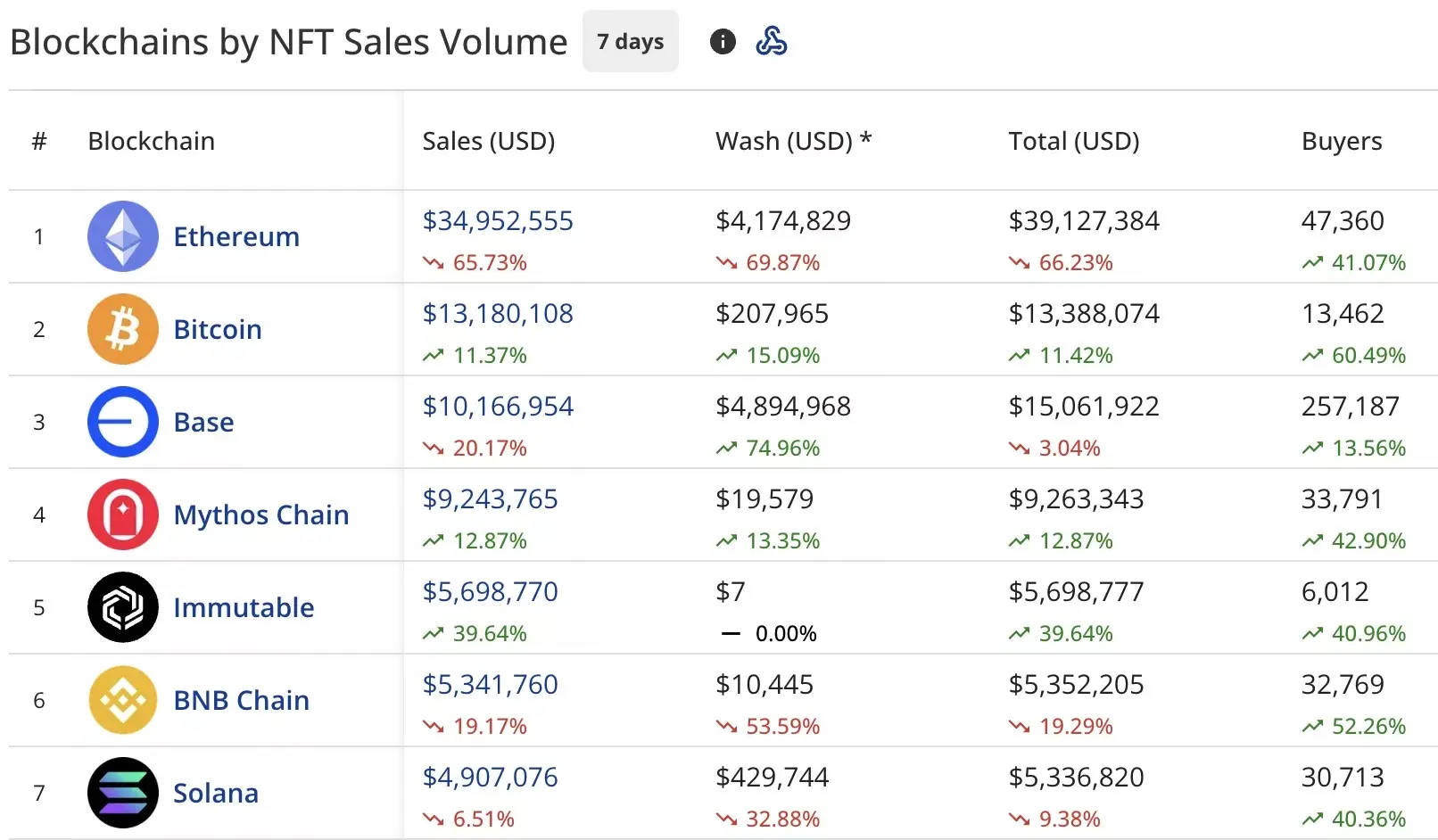 اتریوم (Ethereum) در صدر جدول فروش قرار گرفت، با رقم ۳۵.۰۴ میلیون دلار که نسبت به هفته گذشته که ۱۰۲.۶۷ میلیون دلار ثبت شده بود، کاهش ۶۵.۶۴ درصدی را نشان میدهد. در این مدت، شبکه اتریوم شاهد ۴.۰۶ میلیون دلار wash trading بوده است که مجموع معاملات این شبکه را به ۳۹.۱۰ میلیون دلار رسانده است.